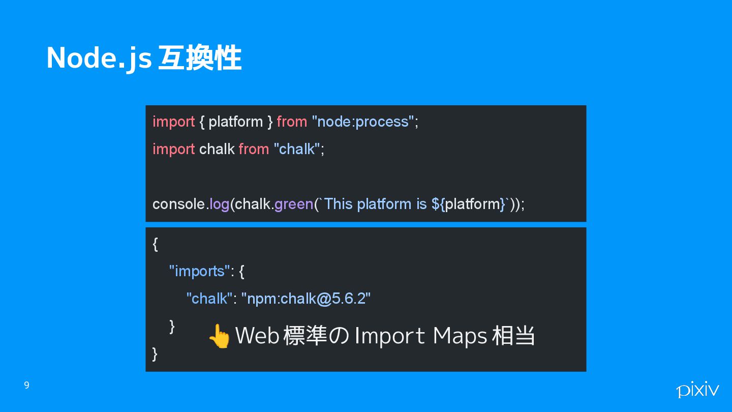 9 Node.js 互換性 import { platform } from "node:process"; import chalk