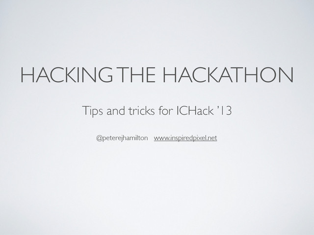 HACKING THE HACKATHON @peterejhamilton www.inspiredpixel.net Tips and tricks for ICHack
