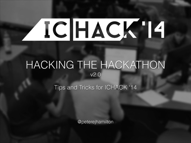 Short pre-event presentation for the attendees of ICHACK '14 on my experience on hackathons and some hints and tips, similar to last year but with nicer images, minor tweaks and 100% more pie charts