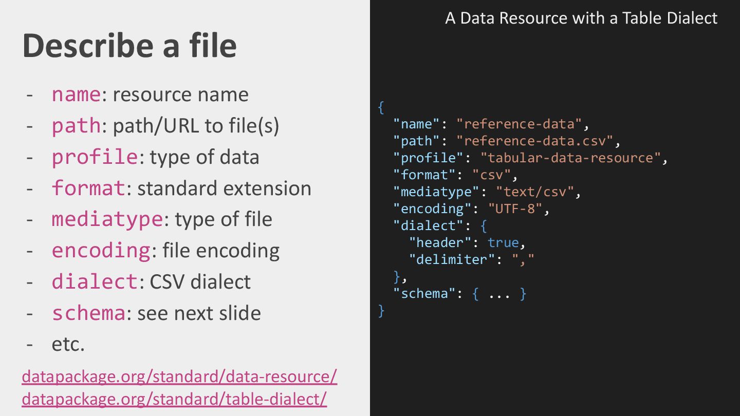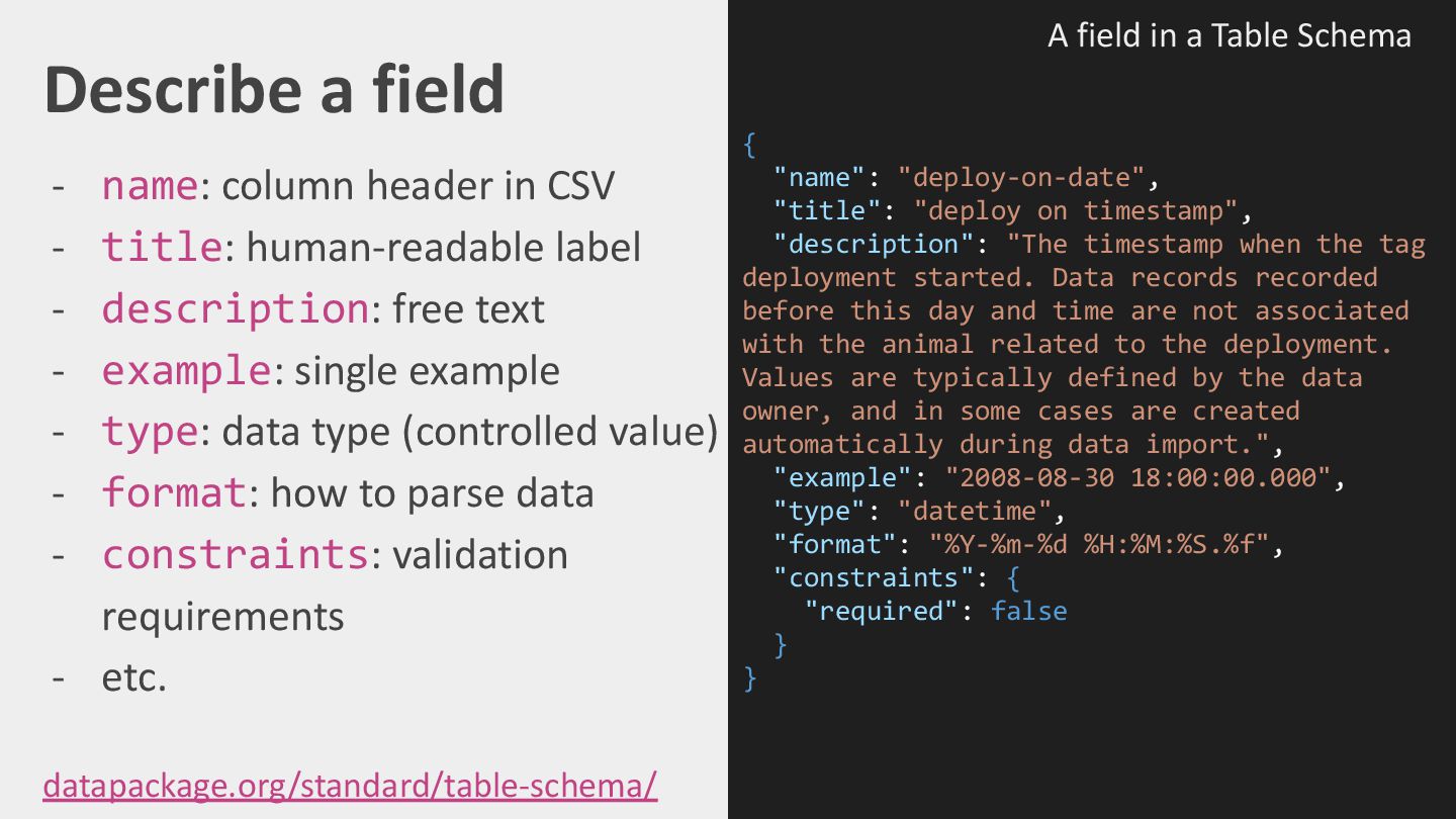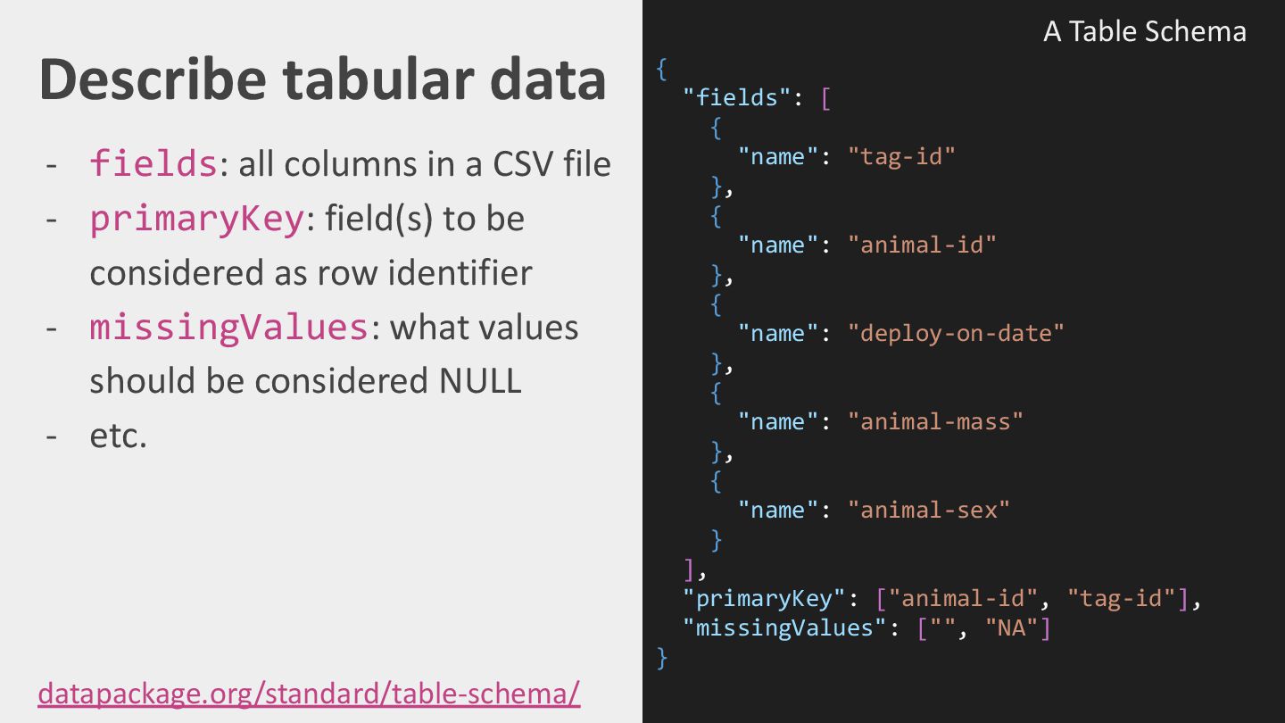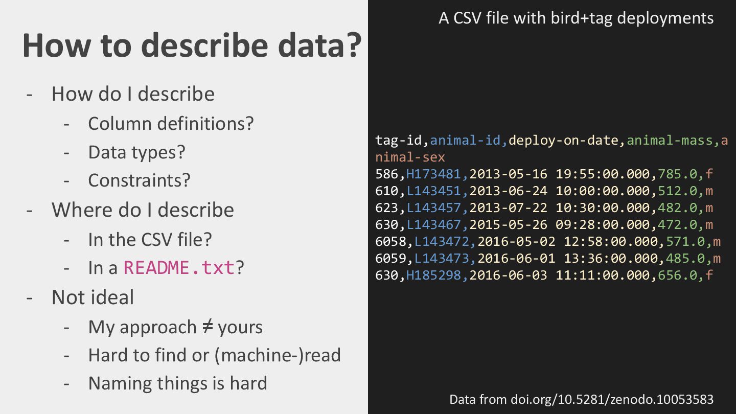 types? - Constraints? - Where do I describe - In the CSV file? - In a README.txt? - Not ideal - My approach ≠ yours - Hard to find or (machine-)read - Naming things is hard How to describe data? tag-id,animal-id,deploy-on-date,animal-mass,a nimal-sex 586,H173481,2013-05-16 19:55:00.000,785.0,f 610,L143451,2013-06-24 10:00:00.000,512.0,m 623,L143457,2013-07-22 10:30:00.000,482.0,m 630,L143467,2015-05-26 09:28:00.000,472.0,m 6058,L143472,2016-05-02 12:58:00.000,571.0,m 6059,L143473,2016-06-01 13:36:00.000,485.0,m 630,H185298,2016-06-03 11:11:00.000,656.0,f Data from doi.org/10.5281/zenodo.10053583 A CSV file with bird+tag deployments
