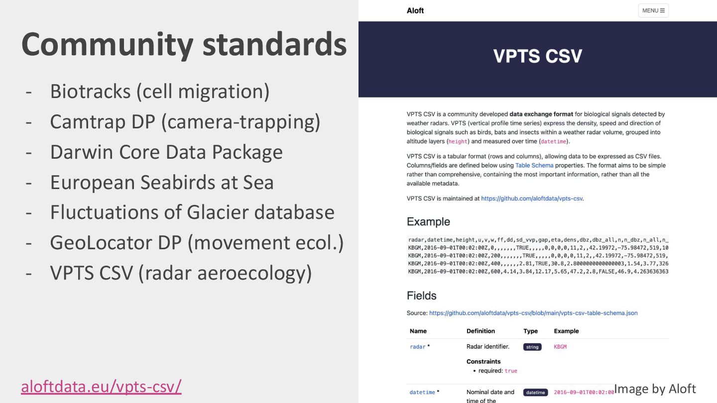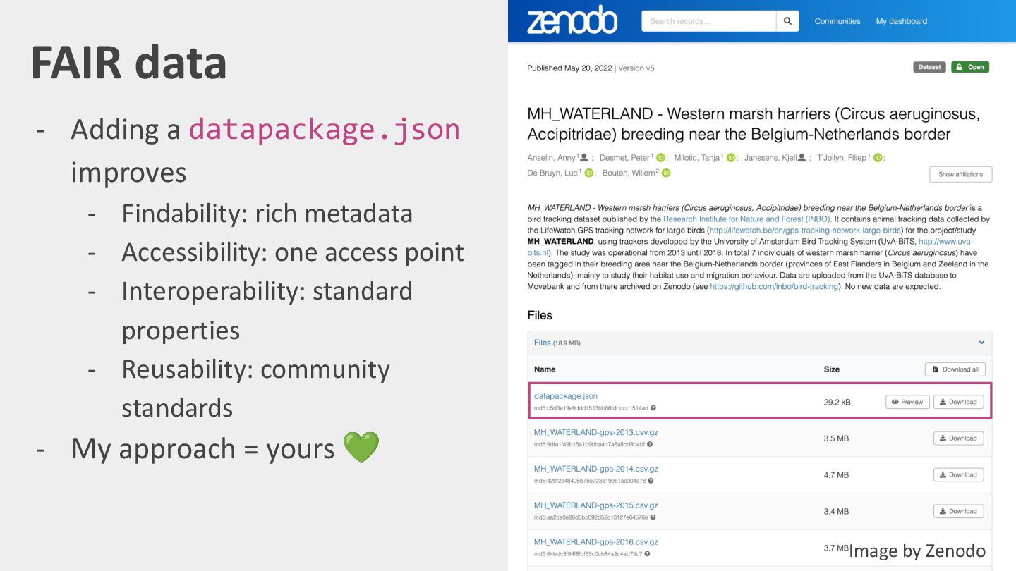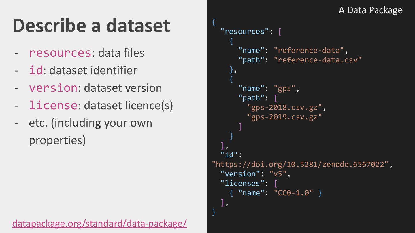 types? - Constraints? - Where do I describe - In the CSV file? - In a README.txt? - Not ideal - My approach ≠ yours - Hard to find or (machine-)read - Naming things is hard How to describe data? tag-id,animal-id,deploy-on-date,animal-mass,a nimal-sex 586,H173481,2013-05-16 19:55:00.000,785.0,f 610,L143451,2013-06-24 10:00:00.000,512.0,m 623,L143457,2013-07-22 10:30:00.000,482.0,m 630,L143467,2015-05-26 09:28:00.000,472.0,m 6058,L143472,2016-05-02 12:58:00.000,571.0,m 6059,L143473,2016-06-01 13:36:00.000,485.0,m 630,H185298,2016-06-03 11:11:00.000,656.0,f Data from doi.org/10.5281/zenodo.10053583 A CSV file with bird+tag deployments