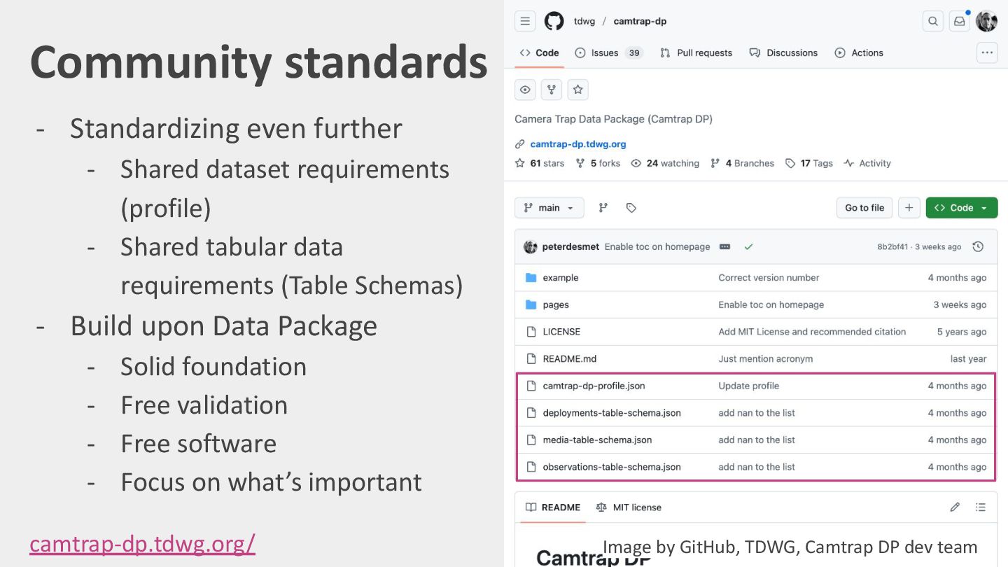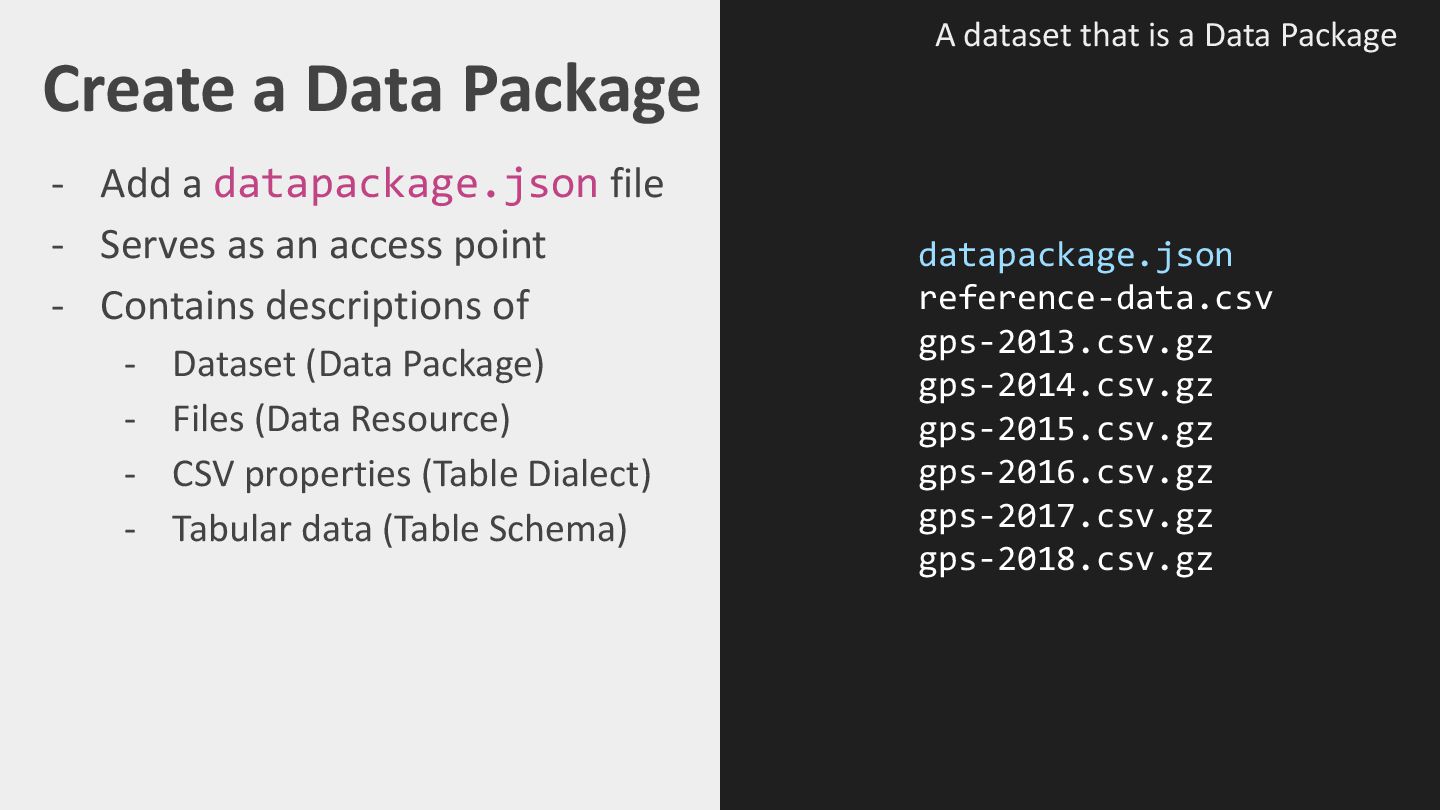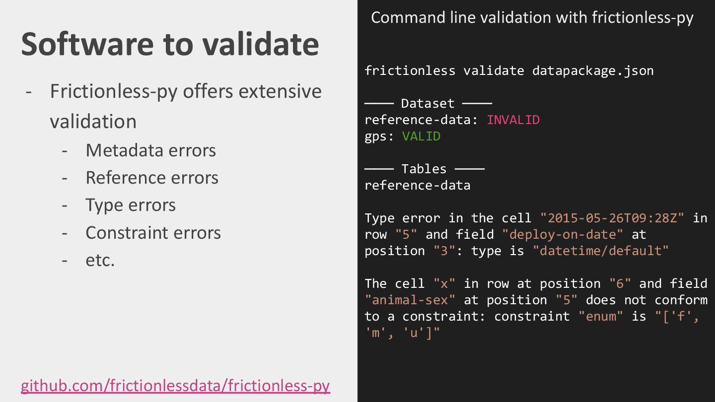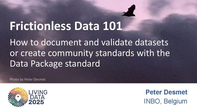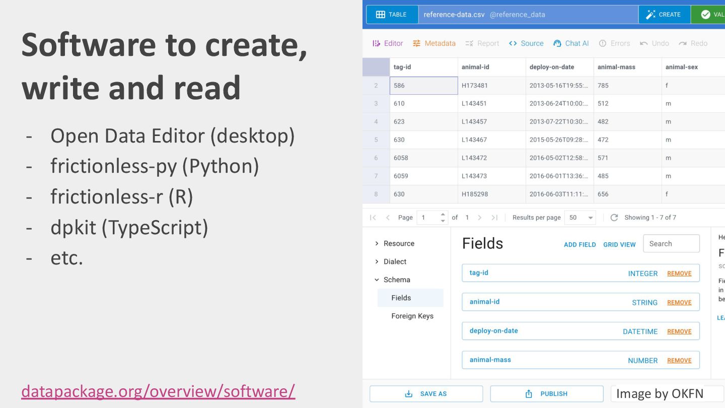 types? - Constraints? - Where do I describe - In the CSV file? - In a README.txt? - Not ideal - My approach ≠ yours - Hard to find or (machine-)read - Naming things is hard How to describe data? tag-id,animal-id,deploy-on-date,animal-mass,a nimal-sex 586,H173481,2013-05-16 19:55:00.000,785.0,f 610,L143451,2013-06-24 10:00:00.000,512.0,m 623,L143457,2013-07-22 10:30:00.000,482.0,m 630,L143467,2015-05-26 09:28:00.000,472.0,m 6058,L143472,2016-05-02 12:58:00.000,571.0,m 6059,L143473,2016-06-01 13:36:00.000,485.0,m 630,H185298,2016-06-03 11:11:00.000,656.0,f Data from doi.org/10.5281/zenodo.10053583 A CSV file with bird+tag deployments