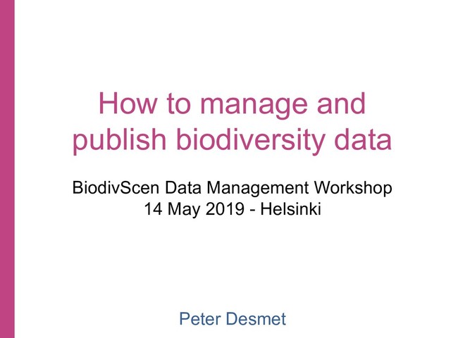 into Darwin Core Document your data with standardized metadata Choose a license: CC0, CC-BY, CC-BY-NC Register your dataset to make it discoverable How to publish data to GBIF