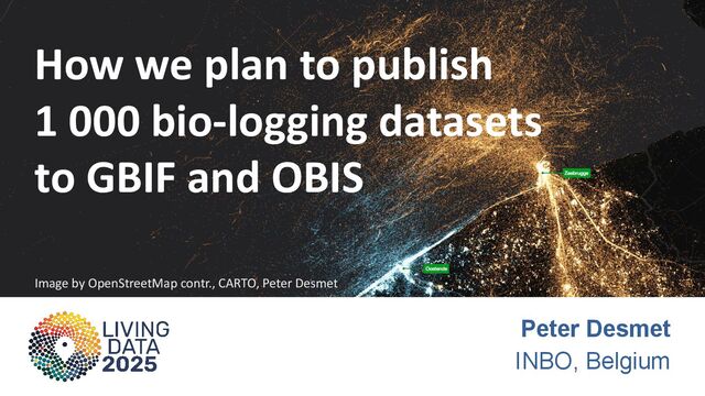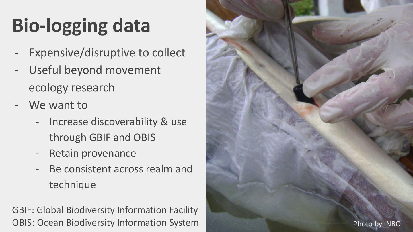 - We want to - Increase discoverability & use through GBIF and OBIS - Retain provenance - Be consistent across realm and technique Bio-logging data Photo by INBO GBIF: Global Biodiversity Information Facility OBIS: Ocean Biodiversity Information System