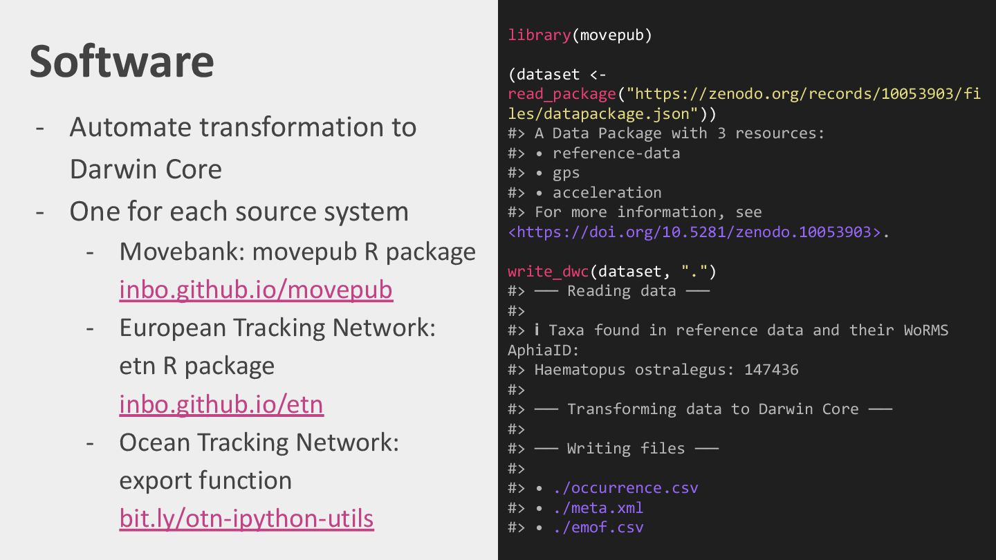 each source system - Movebank: movepub R package inbo.github.io/movepub - European Tracking Network: etn R package inbo.github.io/etn - Ocean Tracking Network: export function bit.ly/otn-ipython-utils library(movepub) (dataset <- read_package("https://zenodo.org/records/10053903/fi les/datapackage.json")) #> A Data Package with 3 resources: #> • reference-data #> • gps #> • acceleration #> For more information, see <https://doi.org/10.5281/zenodo.10053903>. write_dwc(dataset, ".") #> ── Reading data ── #> #> ℹ Taxa found in reference data and their WoRMS AphiaID: #> Haematopus ostralegus: 147436 #> #> ── Transforming data to Darwin Core ── #> #> ── Writing files ── #> #> • ./occurrence.csv #> • ./meta.xml #> • ./emof.csv