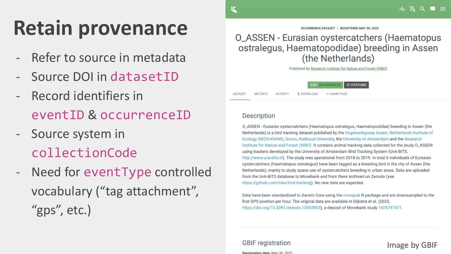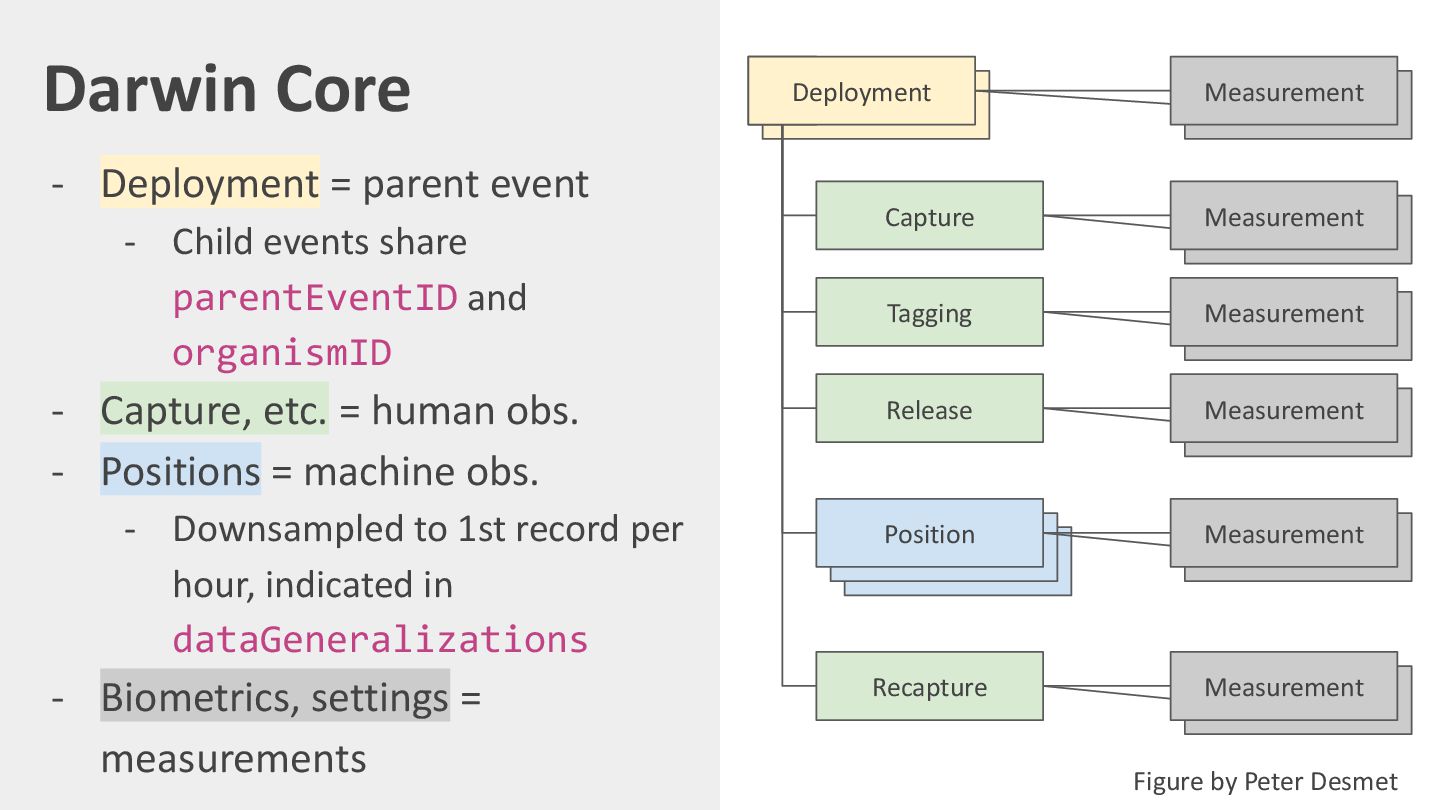 DOI in datasetID - Record identifiers in eventID & occurrenceID - Source system in collectionCode - Need for eventType controlled vocabulary (“tag attachment”, “gps”, etc.) Image by GBIF