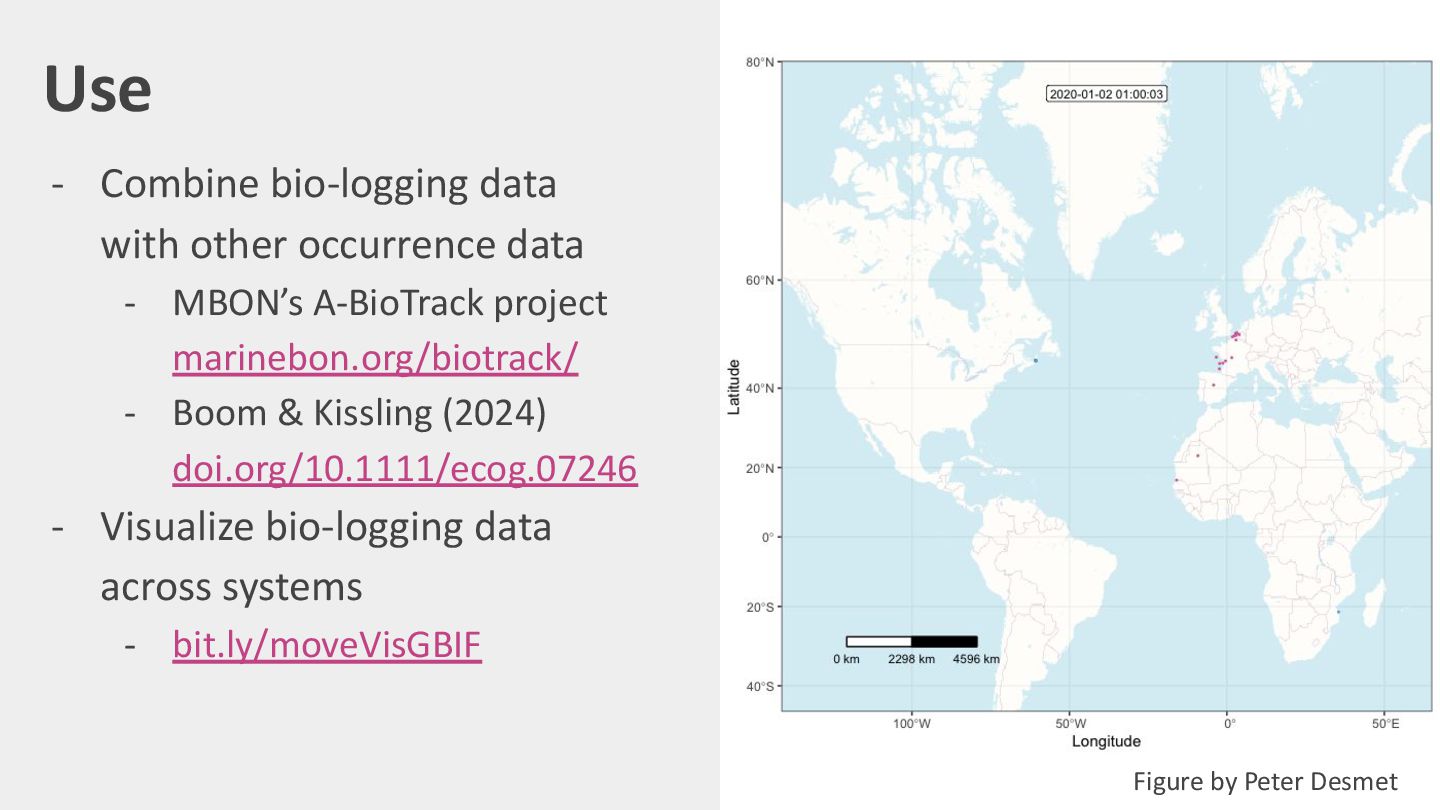A-BioTrack project marinebon.org/biotrack/ - Boom & Kissling (2024) doi.org/10.1111/ecog.07246 - Visualize bio-logging data across systems - bit.ly/moveVisGBIF Use Figure by Peter Desmet