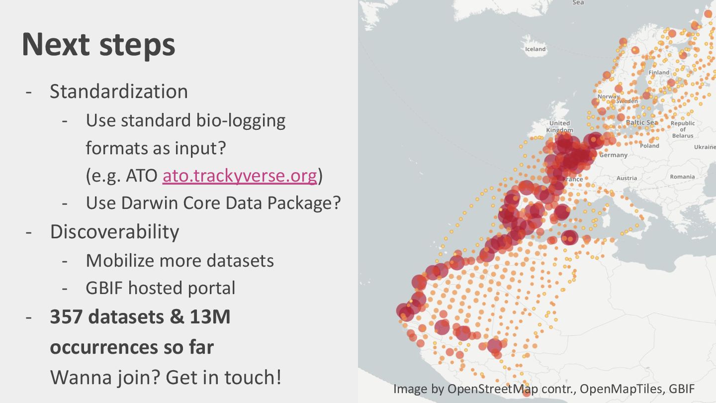 ATO ato.trackyverse.org) - Use Darwin Core Data Package? - Discoverability - Mobilize more datasets - GBIF hosted portal - 357 datasets & 13M occurrences so far Wanna join? Get in touch! Next steps Image by OpenStreetMap contr., OpenMapTiles, GBIF