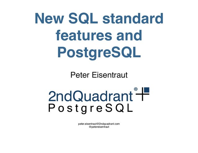 The SQL standard is not standing still. SQL:2016 introduced the latest round of features, and a new standard is expected in 2020. What does that mean for PostgreSQL, the most SQL-conforming relational database system? Let's take a look what new features recent SQL standard releases have brought. One of the main features of SQL:2016 is JSON support. PostgreSQL has been a leader of JSON support among relational databases, and PostgreSQL 12 and beyond will bring the SQL standard interfaces on top of existing JSON support. Other features in SQL:2016 being considered for future PostgreSQL releases include row-pattern recognition and several new functions and data types. A number of new features are being worked on for SQL:2020, among which graph database functionality is the most notable. We'll discuss some of these past and future features, the relationship with other SQL implementations, the SQL standardization process and adoption in PostgreSQL.