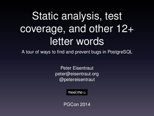 It is hard to maintain complex C code free of bugs. Numerous tools have been developed to help, and we have thrown many of them at the PostgreSQL source code.