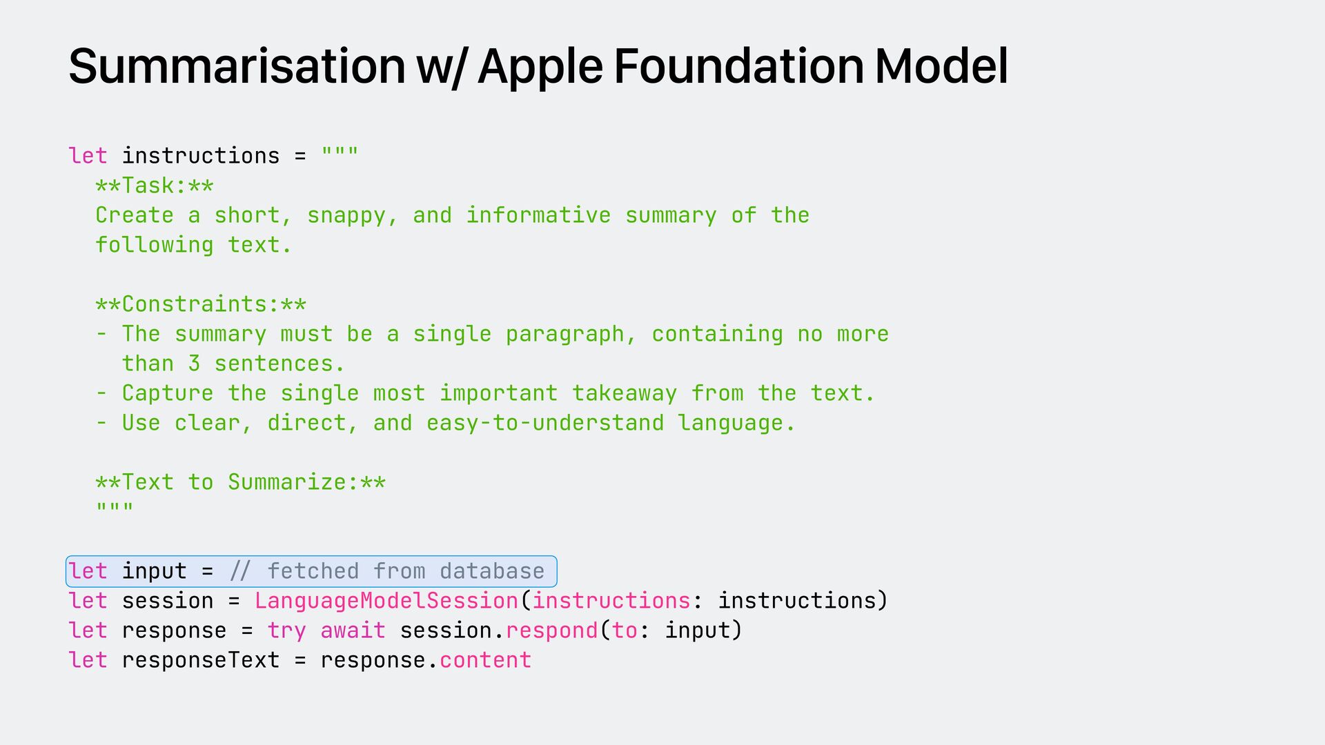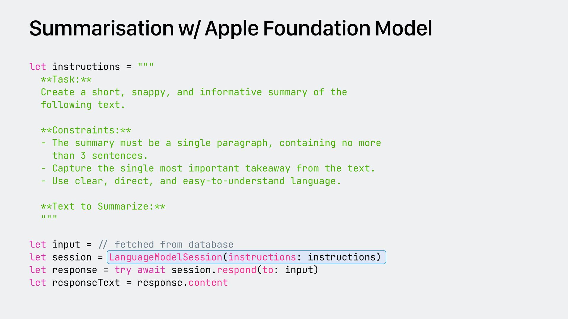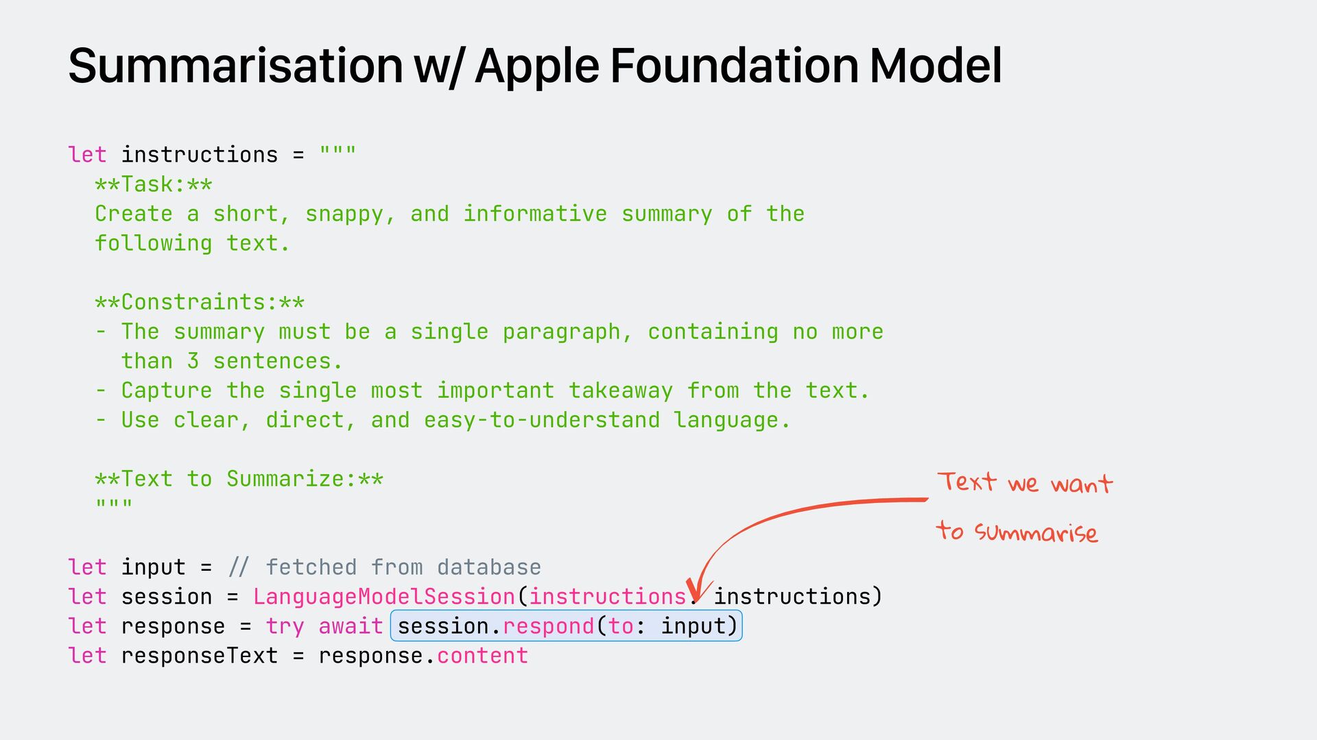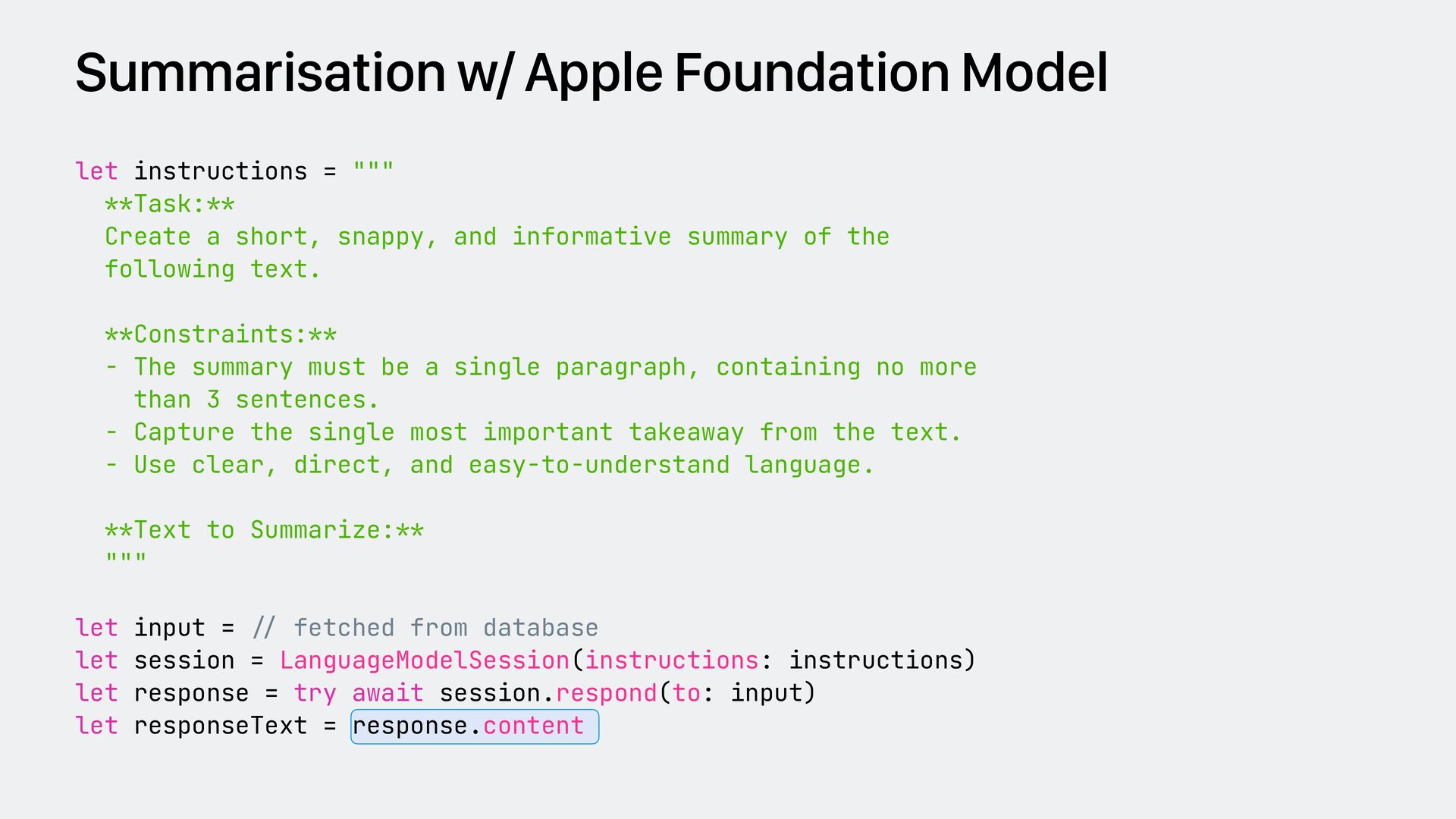 - Use Apple's new `FoundationModels` API to run fast, on-device generation.