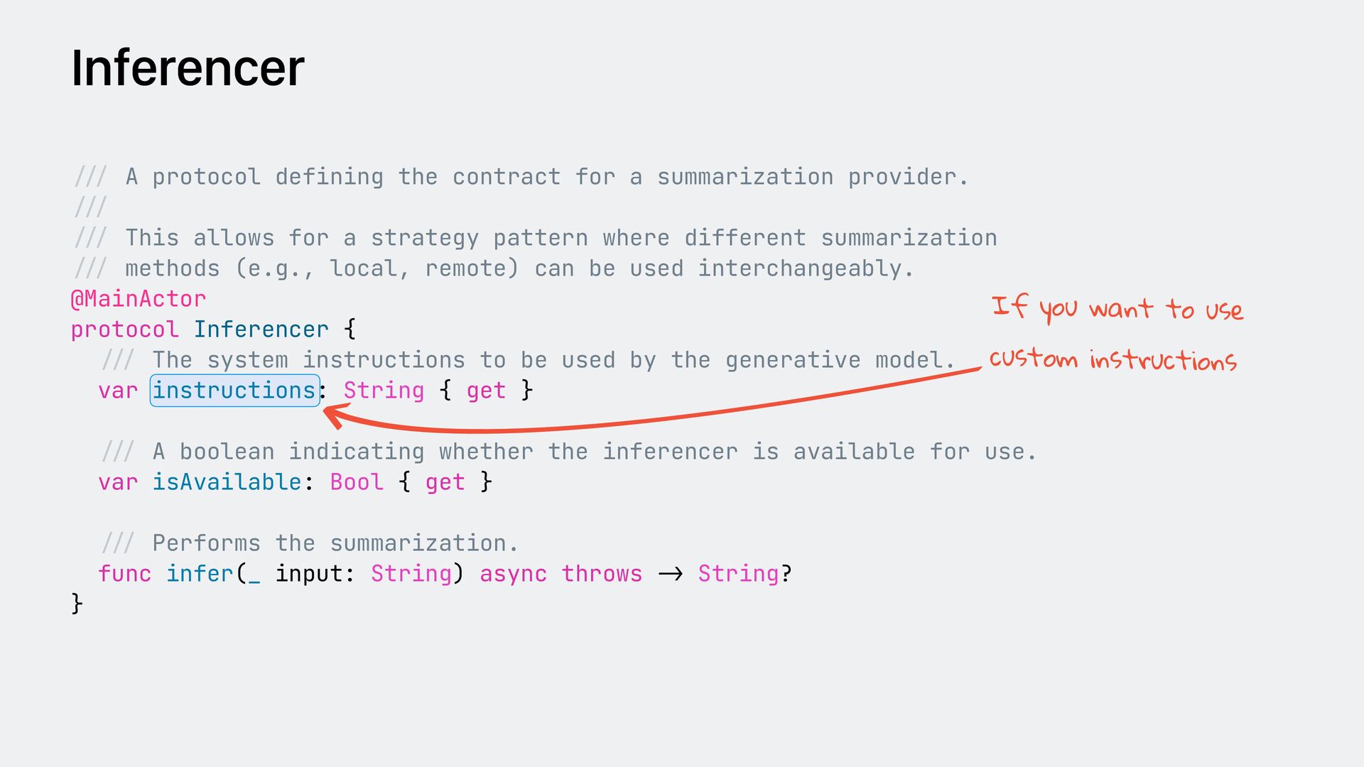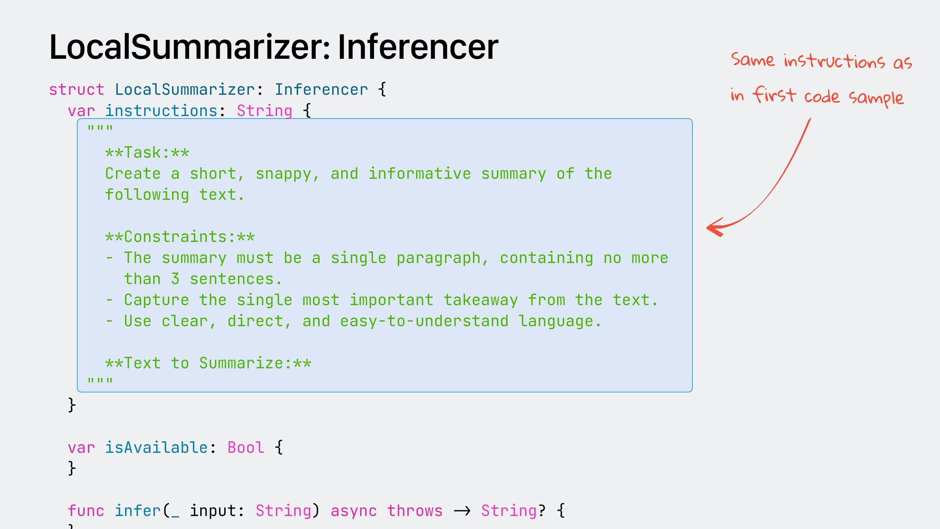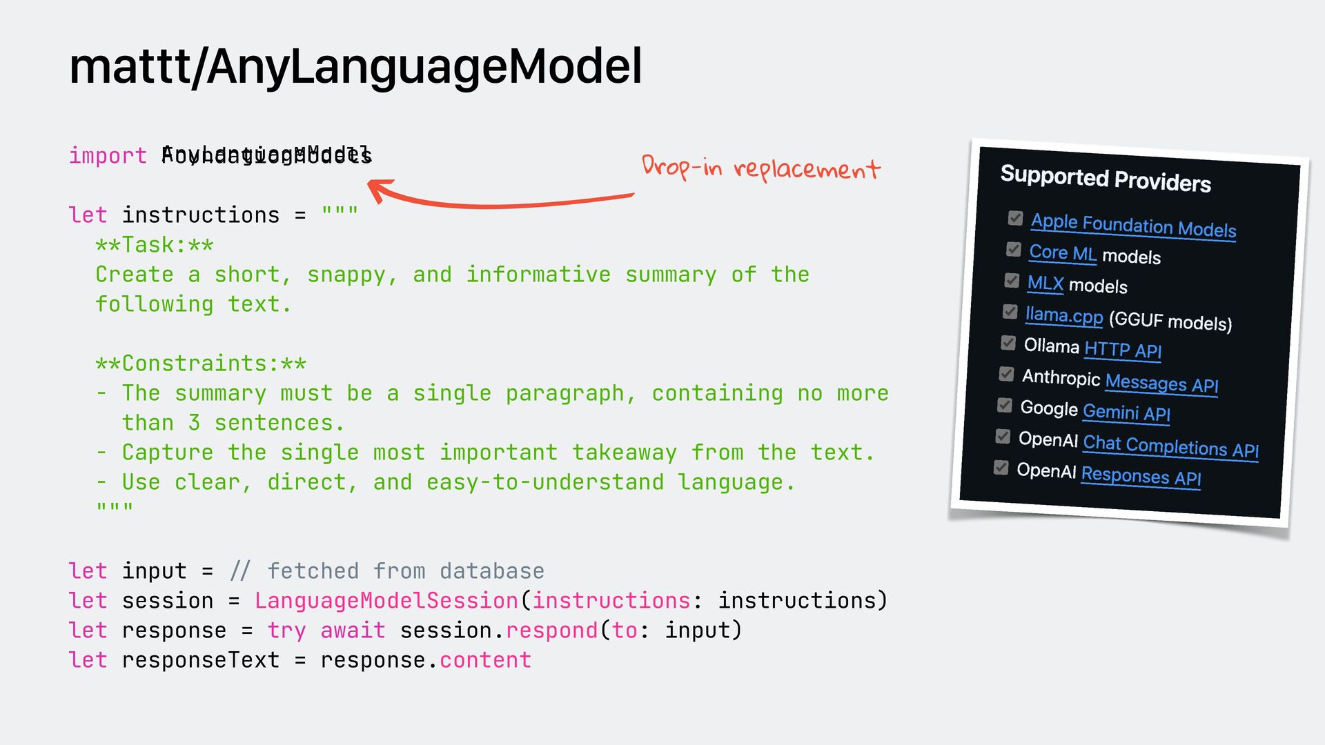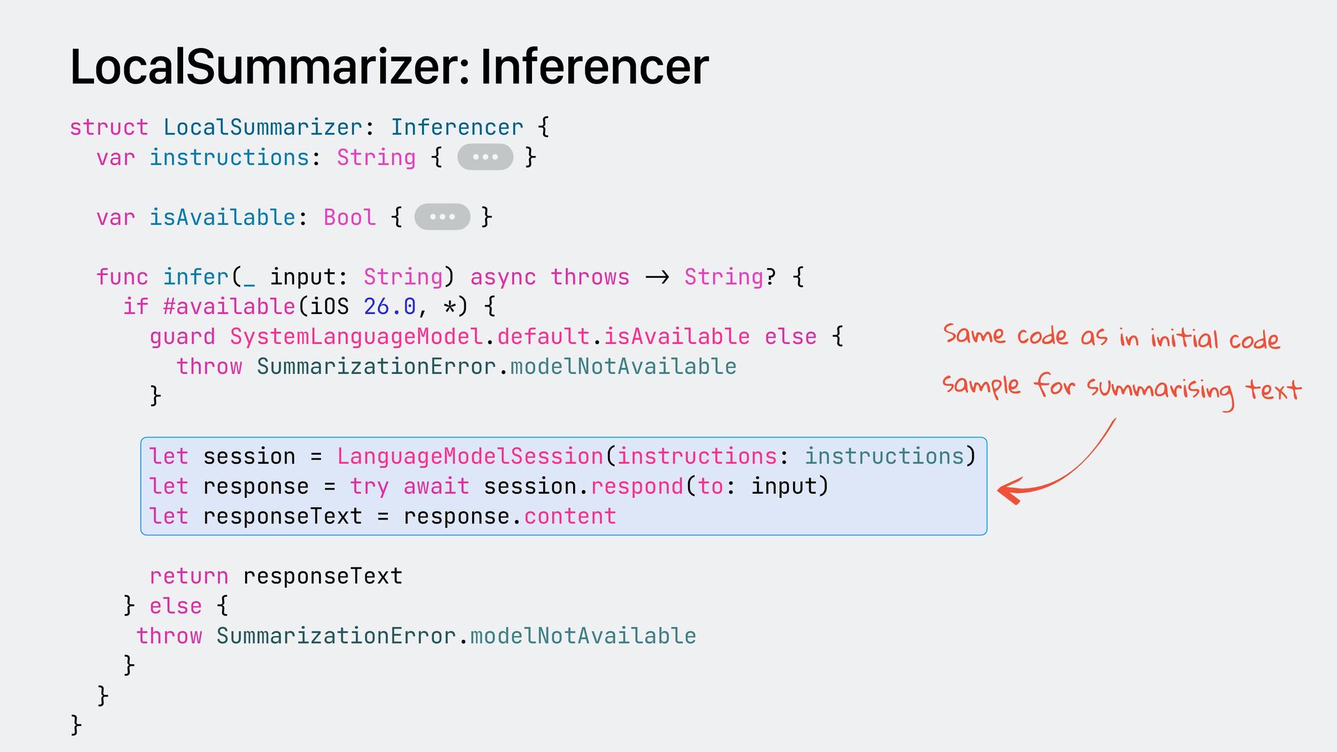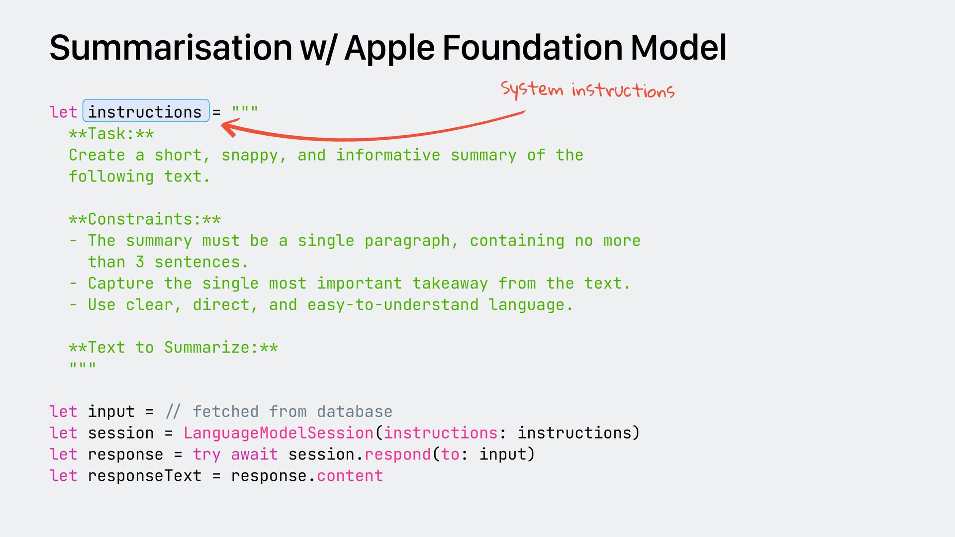- Use Apple's new `FoundationModels` API to run fast, on-device generation.
