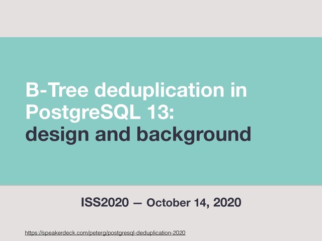 just released): Deduplication Work by Anastasia Lubennikova and myself (Peter Geoghegan) Targets standard B-Tree access method (default index type in Postgres) Simple idea: only store key once — not once per index entry - Before: ‘KeyA’, (1,22), ‘KeyA’, (1,23), ‘KeyA’, (1,24) - After: ‘KeyA’, (1,22)(1,23)(1,24)
