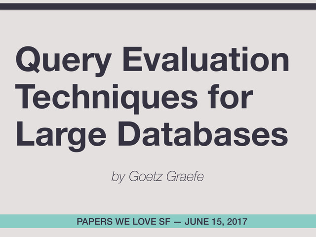 HASHING 2.1 Sorting 2.2 Hashing 3. DISK ACCESS 3.1 File Scans 3.2 Associative Access Using Indices 3.3 Buffer Management 4. AGGREGATION AND DUPLICATE REMOVAL 4.1 Aggregation Algorithm Based on Nested Loops 4.2 Aggregation Algorithms Based on Sorting 4.3 Aggregation Algorithms Based on Hashing 4.4 A Rough Performance Comparison 4.5 Additional Remarks on Aggregation 5. BINARY MATCHING OPERATIONS 5.1 Nested-Loops Join Algorithms 5.2 Merge-Join Algorithms 5.3 Hash Join Algorithms 5.4 Pointer-Based Joins 5.5 A Rough Performance Comparison 6. UNIVERSAL QUANTIFICATION 7. DUALITY OF SORT AND HASH-BASED QUERY PROCESSING ALGORITHMS 8. EXECUTION OF COMPLEX QUERY PLANS 9. MECHANISMS FOR PARALLEL QUERY 9.1 Parallel versus Distributed Database Systems 9.2 Forms of Parallelism 9.3 Implementation Strategies 9.4 Load Balancing and Skew 9.5 Architectures and Architecture Independence 10. PARALLEL ALGORITHMS 10.1 Parallel Selections and Updates 10.2 Parallel Sorting 10.3 Parallel Aggregation and Duplicate Removal 10.4 Parallel Joins and Other Binary Matching Operations 10.5 Parallel Universal Quantification 11. NONSTANDARD QUERY PROCESSING ALGORITHMS 11.1 Nested Relations 11.2 Temporal and Scientific Database Management 11.3 Object-oriented Database Systems 11.4 More Control Operators 12. ADDITIONAL TECHNIQUES FOR PERFORMANCE IMPROVEMENT 12.1 Precomputation and Derived Data 12.2 Data Compression 12.3 Surrogate Processing 12.4 Bit Vector Filtering 12.5 Specialized Hardware Survey paper. 86 pages! Sections can be read more or less independently, though. Similar observations made in sections we’ll skip.