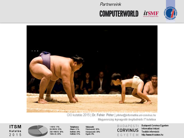 fő: 26% Tulajdonos Állami: 31% Belföldi: 28% Külföldi: 41% Válaszadó Felsővezető: 56% Középvezető: 36% Egyéb: 8% ITSM K u t a t á s 2 0 1 5 Budapesti Corvinus Egyetem Informatikai Intézet További információ: http://www.it-kutatas.hu Partnereink CIO kutatás 2015 | Dr. Fehér Péter | [email protected] Magyarország legnagyobb longitudinális IT kutatása