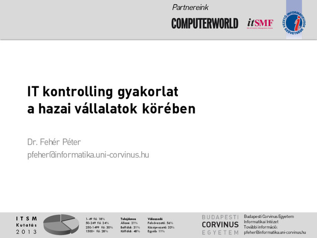 fő: 28% Tulajdonos Állami: 21% Belföldi: 31% Külföldi: 48% Válaszadó Felsővezető: 56% Középvezető: 33% Egyéb: 11% I T S M K u t a tá s 2 0 1 3 Budapesti Corvinus Egyetem Informatikai Intézet További információ: [email protected] IT kontrolling gyakorlat a hazai vállalatok körében Dr. Fehér Péter [email protected] Partnereink
