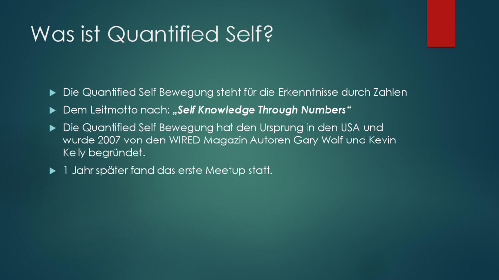 für die Erkenntnisse durch Zahlen Dem Leitmotto nach: „Self Knowledge Through Numbers“ Die Quantified Self Bewegung hat den Ursprung in den USA und wurde 2007 von den WIRED Magazin Autoren Gary Wolf und Kevin Kelly begründet. 1 Jahr später fand das erste Meetup statt.