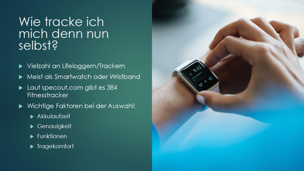 Lifeloggern/Trackern Meist als Smartwatch oder Wristband Laut specout.com gibt es 384 Fitnesstracker Wichtige Faktoren bei der Auswahl: Akkulaufzeit Genauigkeit Funktionen Tragekomfort