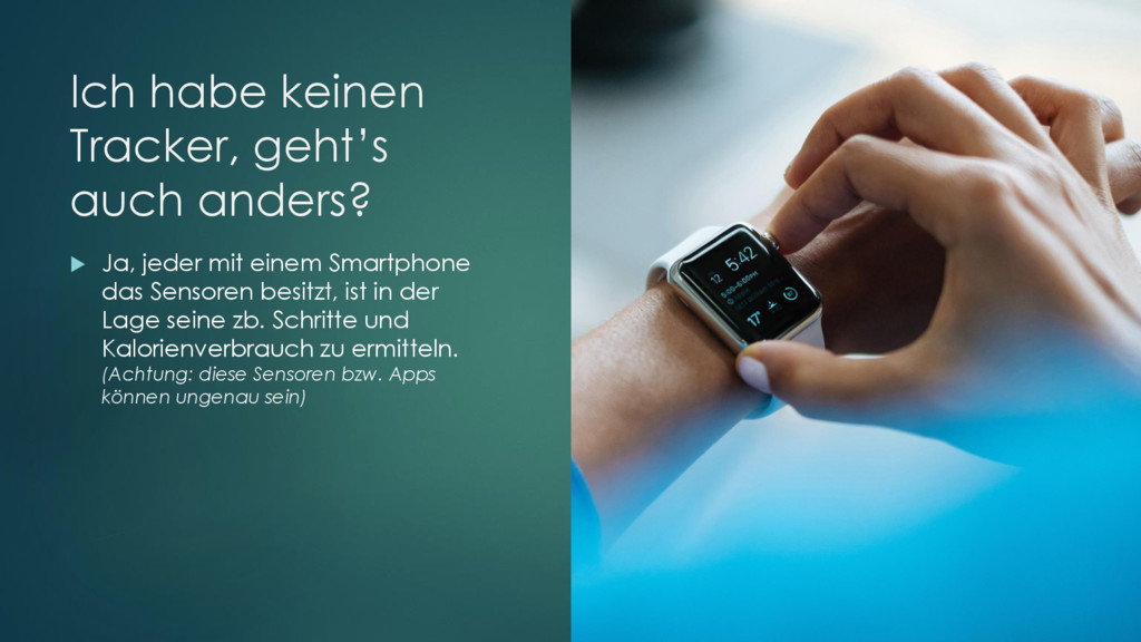 mit einem Smartphone das Sensoren besitzt, ist in der Lage seine zb. Schritte und Kalorienverbrauch zu ermitteln. (Achtung: diese Sensoren bzw. Apps können ungenau sein)