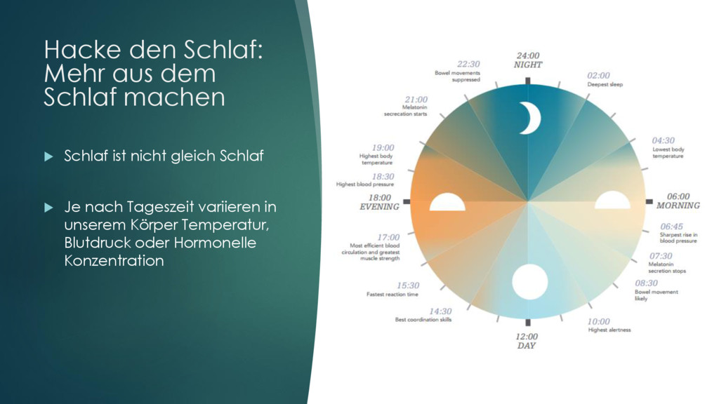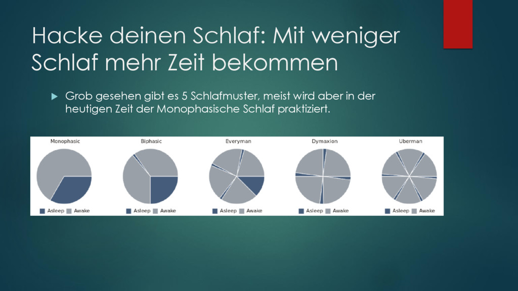 Leichtschlaf (N1, Übergang in den Schlaf) Stabiler Schlaf (N2) Tiefschlaf (N3) REM-Schlaf (R), nimmt ¼ des Gesamtschlafes in Anspruch Liegt ~10 Minuten und wird im laufe des Schlafes länger bis 20 Minuten