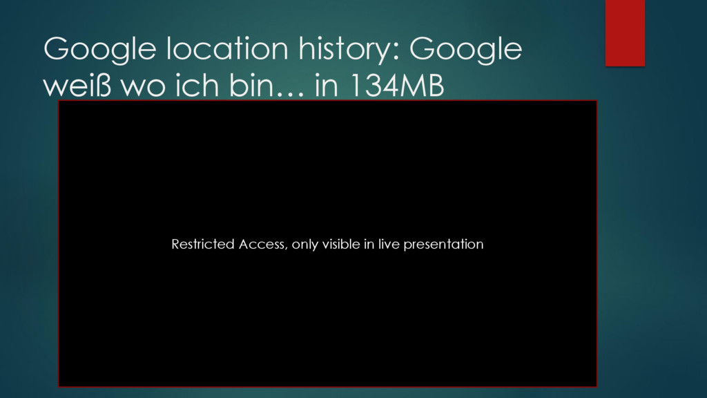 Google location history greift über die Google play services auf den Standort (WLAN,GPS,GSM) zu und speichert die Daten. Grund: Lokale Werbung passend Anzeigen, Wetter in Google Now zeigen, Fotos ohne GPS info einem Gebiet zu ordnen Restricted Access, only visible in live presentation