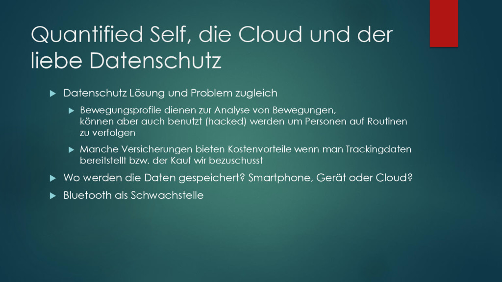 Lösung und Problem zugleich Bewegungsprofile dienen zur Analyse von Bewegungen, können aber auch benutzt (hacked) werden um Personen auf Routinen zu verfolgen Manche Versicherungen bieten Kostenvorteile wenn man Trackingdaten bereitstellt bzw. der Kauf wir bezuschusst Wo werden die Daten gespeichert? Smartphone, Gerät oder Cloud? Bluetooth als Schwachstelle