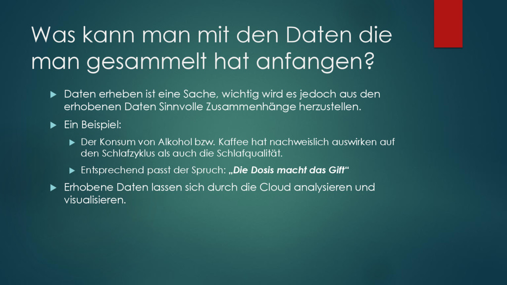 anfangen? Daten erheben ist eine Sache, wichtig wird es jedoch aus den erhobenen Daten Sinnvolle Zusammenhänge herzustellen. Ein Beispiel: Der Konsum von Alkohol bzw. Kaffee hat nachweislich auswirken auf den Schlafzyklus als auch die Schlafqualität. Entsprechend passt der Spruch: „Die Dosis macht das Gift“ Erhobene Daten lassen sich durch die Cloud analysieren und visualisieren.