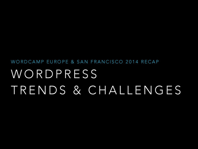 A quick recap of the WordPress news and reports, mentioned at two of the biggest WordPress conferences in 2014 - WordCamp Europe & WordCamp San Francisco. Slides include growth trends as mentioned in Matt Mullenweg's "State of the Word" and some of the other hot topics discussed during the events.