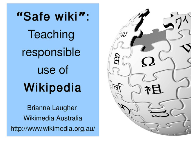 ” Brianna Laugher (Wikimedia Australia), ACEC 2008 http://www.wikimedia.org.au/ 32 Don Carter, the English inspector at the Board of Studies, said the course was intended to teach students skills of analysis to enable them to be more discerning about content they found on the web. "It was felt that Wikipedia reflected notions of the global village; that fluidity, of being up to date and changing in a way that other websites don't do."