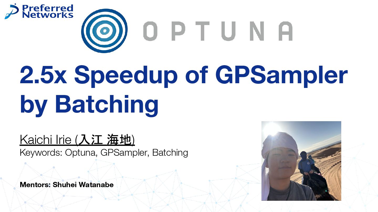 PFN 2025 夏期国内インターンシップにおける入江海地さんの成果発表資料です。バッチ化によるOptunaのGPSampler高速化に取り組み、2.5倍の高速化を達成しました。