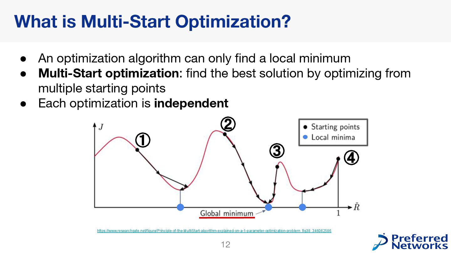 only find a local minimum • Multi-Start optimization: find the best solution by optimizing from multiple starting points • Each optimization is independent https://www.researchgate.net/figure/Principle-of-the-MultiStart-algorithm-explained-on-a-1-parameter-optimization-problem_fig38_346062586 ① ③ ② ④