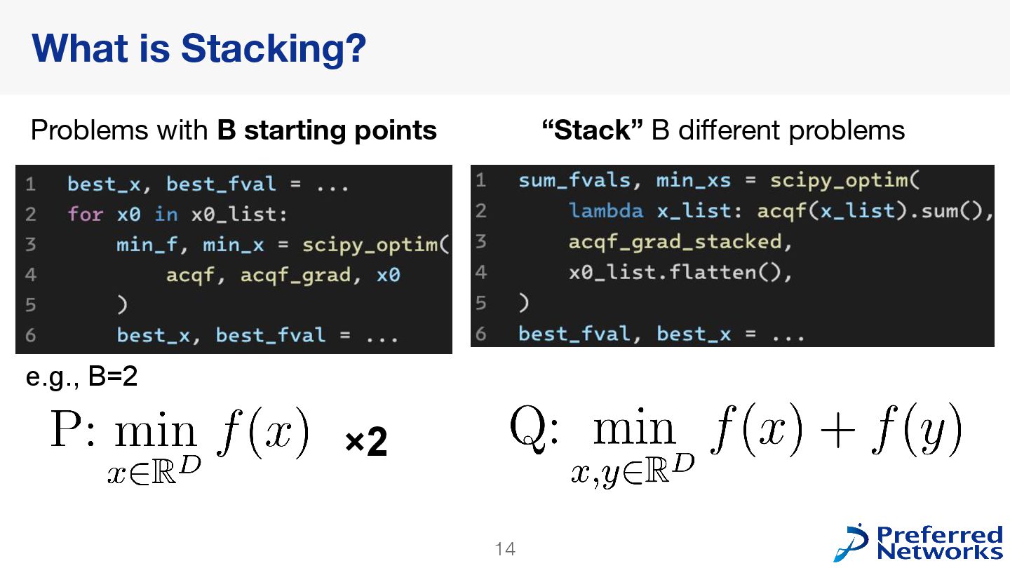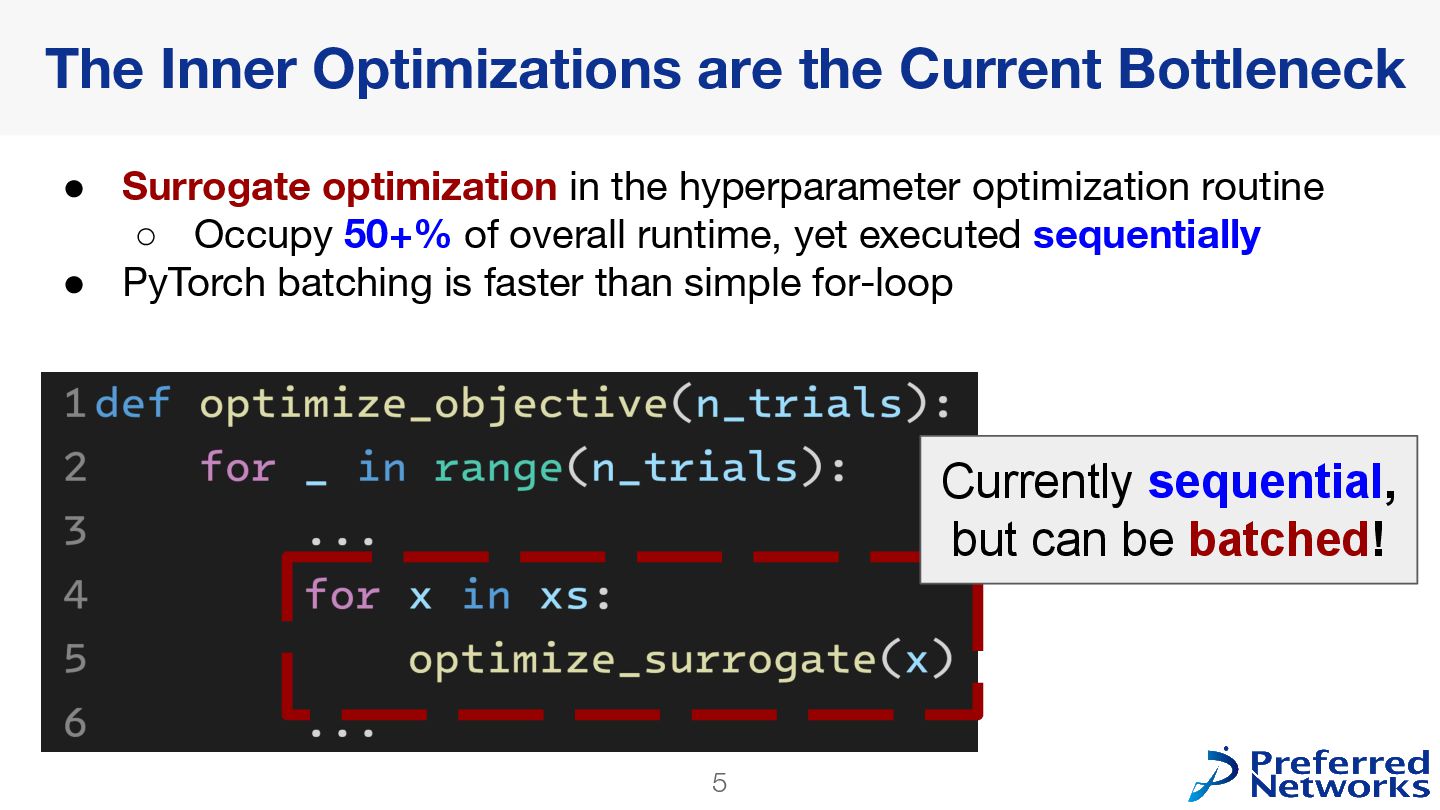 but slow, creating a critical bottleneck in real-world, large-scale optimization tasks Objective • Accelerate GPSampler without compromising its optimization accuracy, the library's usability, and maintainability Approach • Replace sequential multi-start optimization with batching Key Achievements & Impact • 2.0-2.5x speedup🚀 without degrading accuracy or usability • Merged into master🎉 : will be available in Optuna v4.6+ 2