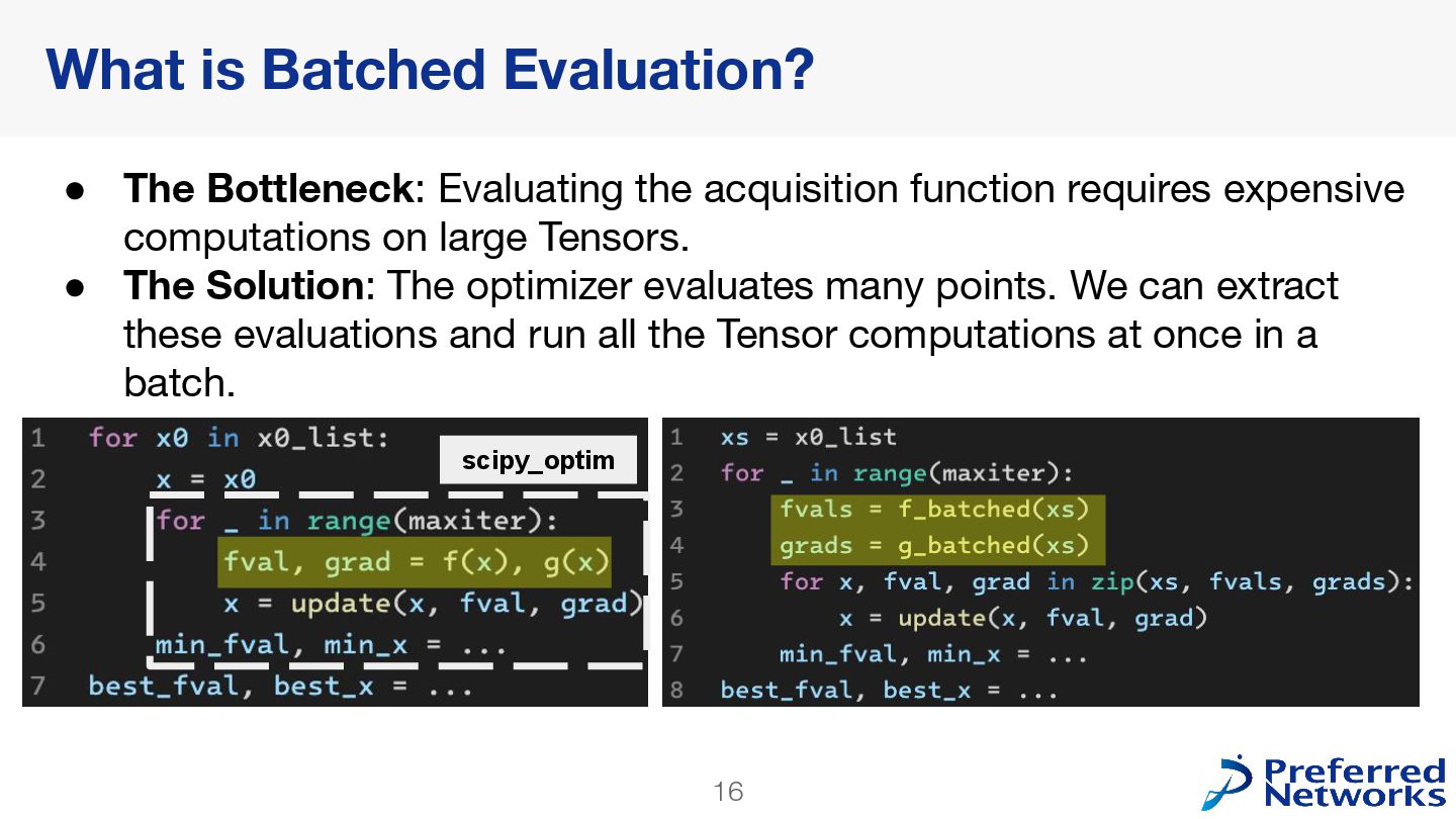 acquisition function requires expensive computations on large Tensors. • The Solution: The optimizer evaluates many points. We can extract these evaluations and run all the Tensor computations at once in a batch. scipy_optim