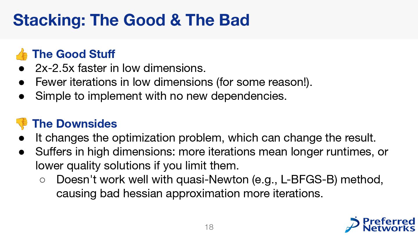 • 2x-2.5x faster in low dimensions. • Fewer iterations in low dimensions (for some reason!). • Simple to implement with no new dependencies. 👎 The Downsides • It changes the optimization problem, which can change the result. • Suffers in high dimensions: more iterations mean longer runtimes, or lower quality solutions if you limit them. ◦ Doesn't work well with quasi-Newton (e.g., L-BFGS-B) method, causing bad hessian approximation more iterations. 18