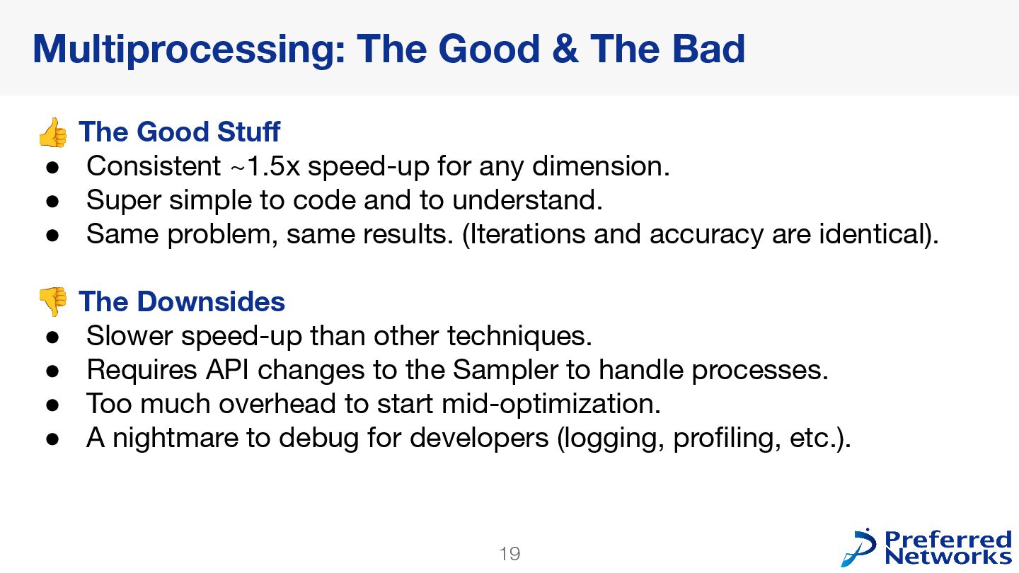 • Consistent ~1.5x speed-up for any dimension. • Super simple to code and to understand. • Same problem, same results. (Iterations and accuracy are identical). 👎 The Downsides • Slower speed-up than other techniques. • Requires API changes to the Sampler to handle processes. • Too much overhead to start mid-optimization. • A nightmare to debug for developers (logging, profiling, etc.). 19