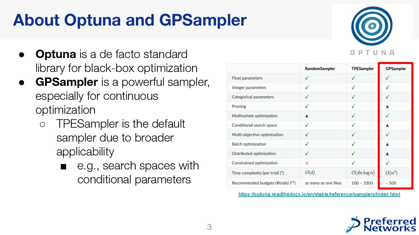 optimization • GPSampler is a powerful sampler, especially for continuous optimization ◦ TPESampler is the default sampler due to broader applicability ▪ e.g., search spaces with conditional parameters About Optuna and GPSampler 3 https://optuna.readthedocs.io/en/stable/reference/samplers/index.html