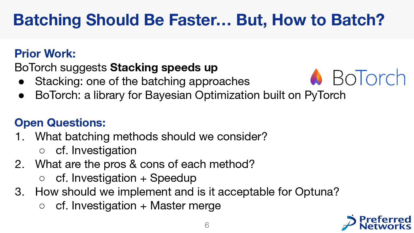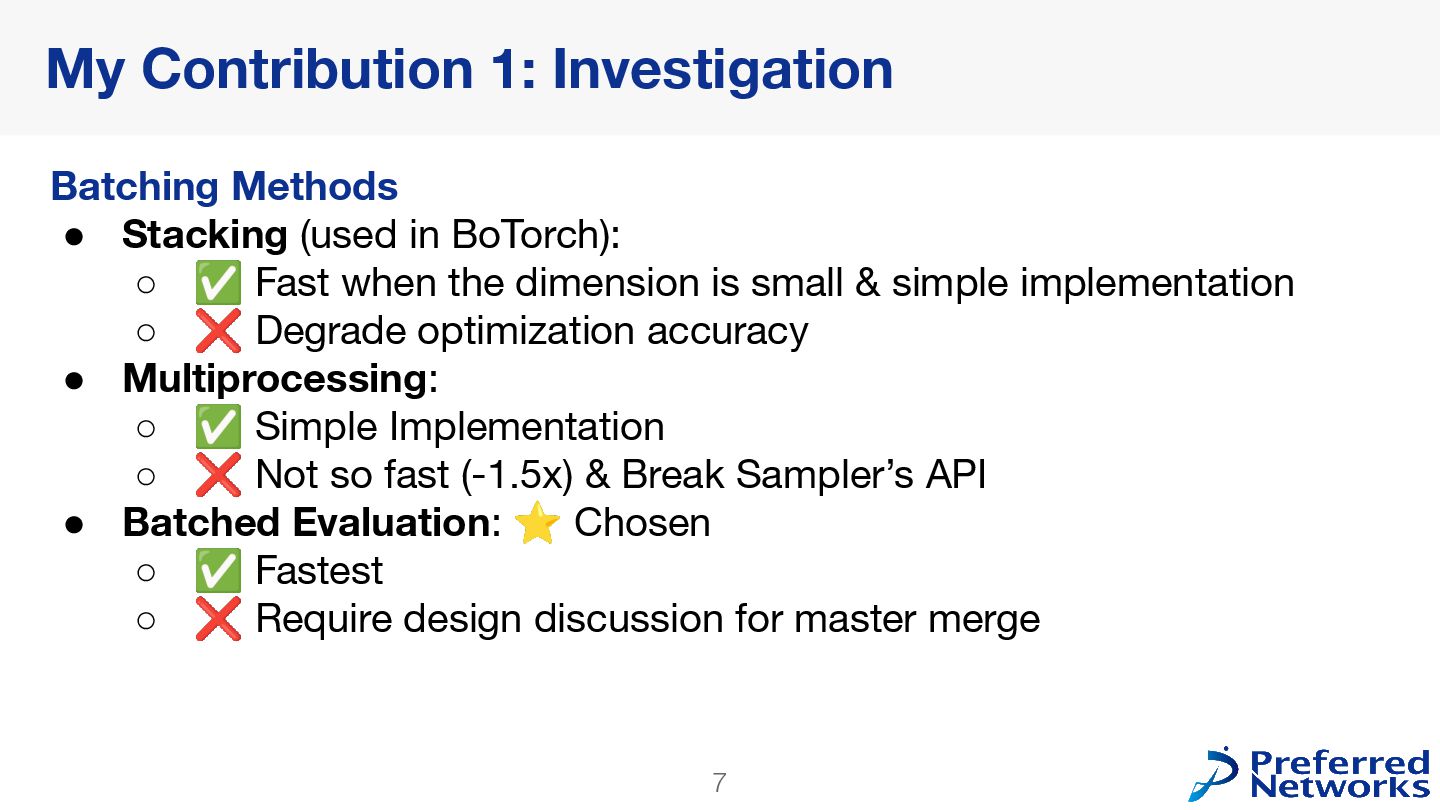BoTorch suggests Stacking speeds up • Stacking: one of the batching approaches • BoTorch: a library for Bayesian Optimization built on PyTorch Open Questions: 1. What batching methods should we consider? ◦ cf. Investigation 2. What are the pros & cons of each method? ◦ cf. Investigation + Speedup 3. How should we implement and is it acceptable for Optuna? ◦ cf. Investigation + Master merge 6