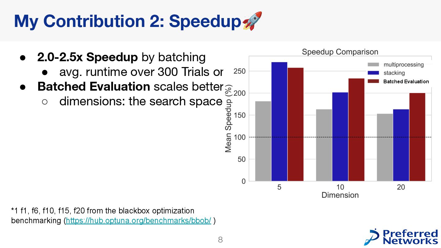 when the dimension is small & simple implementation ◦ ❌ Degrade optimization accuracy • Multiprocessing: ◦ ✅ Simple Implementation ◦ ❌ Not so fast (-1.5x) & Break Sampler’s API • Batched Evaluation: ⭐ Chosen ◦ ✅ Fastest ◦ ❌ Require design discussion for master merge My Contribution 1: Investigation 7