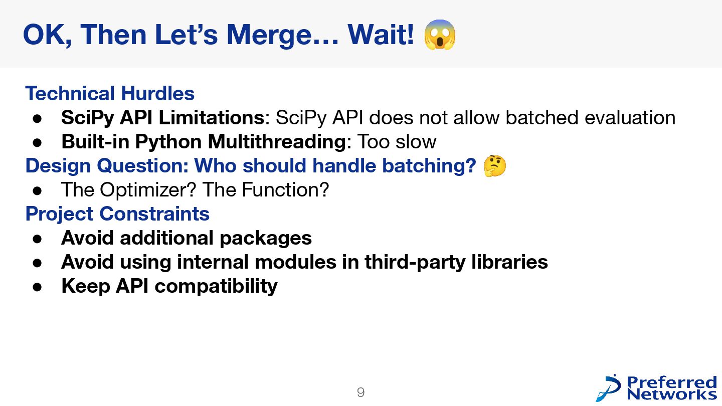 API Limitations: SciPy API does not allow batched evaluation • Built-in Python Multithreading: Too slow Design Question: Who should handle batching? 🤔 • The Optimizer? The Function? Project Constraints • Avoid additional packages • Avoid using internal modules in third-party libraries • Keep API compatibility 9