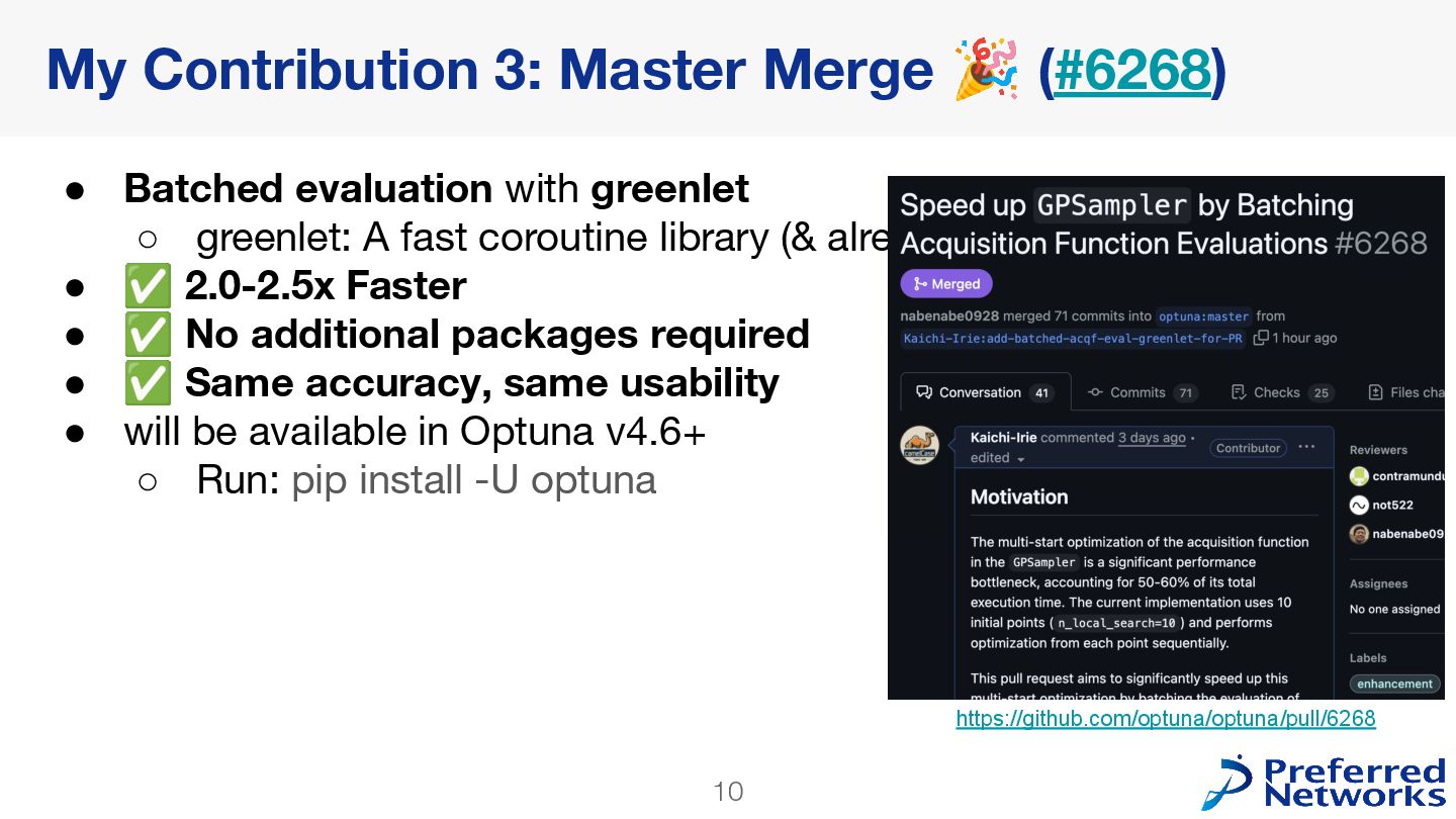 library (& already in Optuna requirement) • ✅ 2.0-2.5x Faster • ✅ No additional packages required • ✅ Same accuracy, same usability • will be available in Optuna v4.6+ ◦ Run: pip install -U optuna My Contribution 3: Master Merge 🎉 (#6268) 10 https://github.com/optuna/optuna/pull/6268