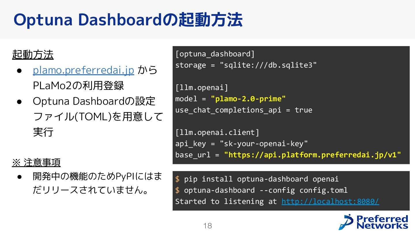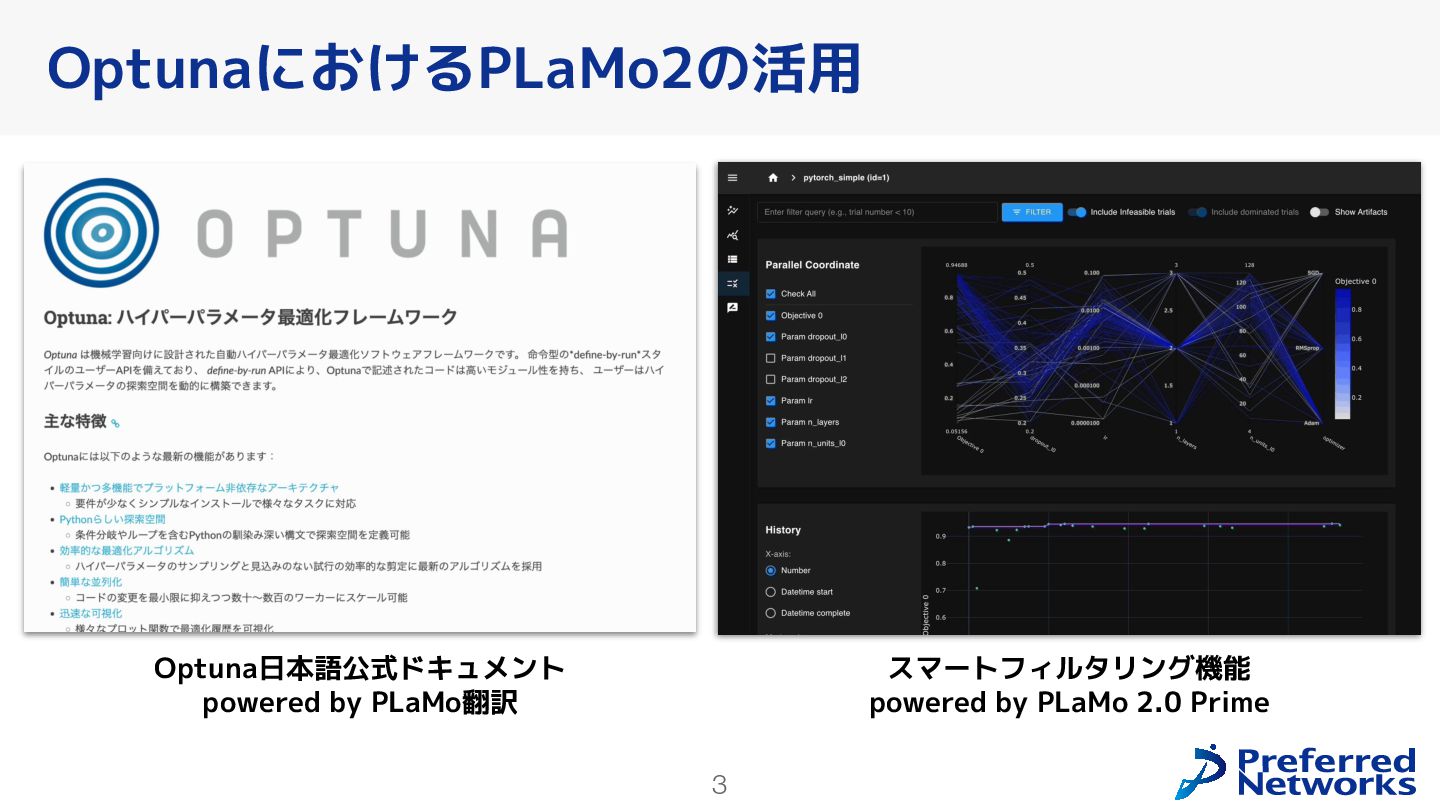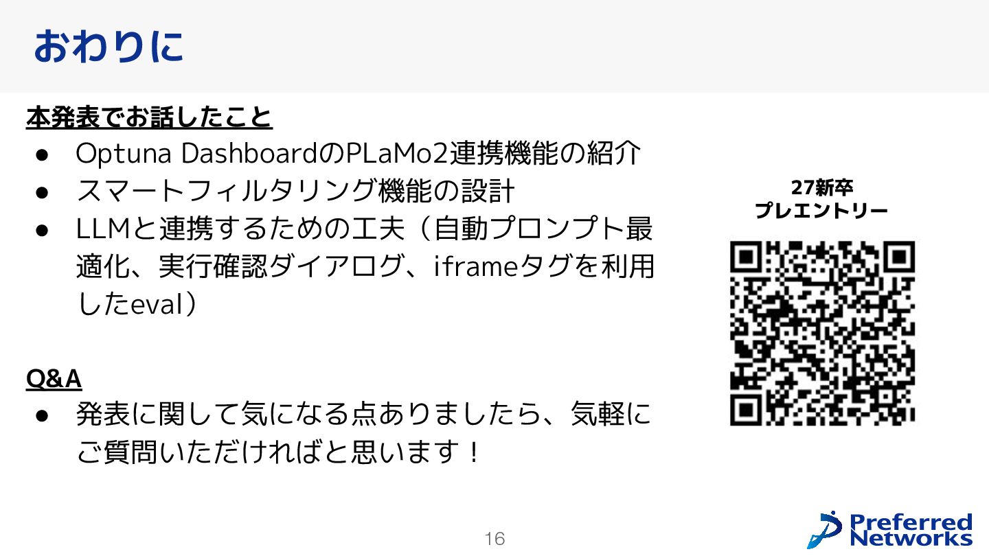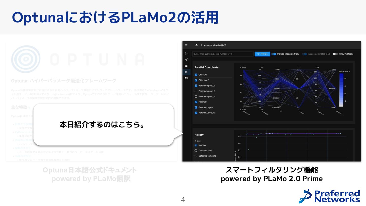 Optuna Dashboardは、ブラックボックス最適化フレームワークOptunaの最適化履歴を手軽に閲覧できるWebダッシュボードです。現在はPLaMo 2.1 Primeを含むLLMとの連携機能の開発を進めています。本発表ではその機能概要や技術的詳細、Webダッシュボード上でLLMと連携するための工夫についてお話します。
