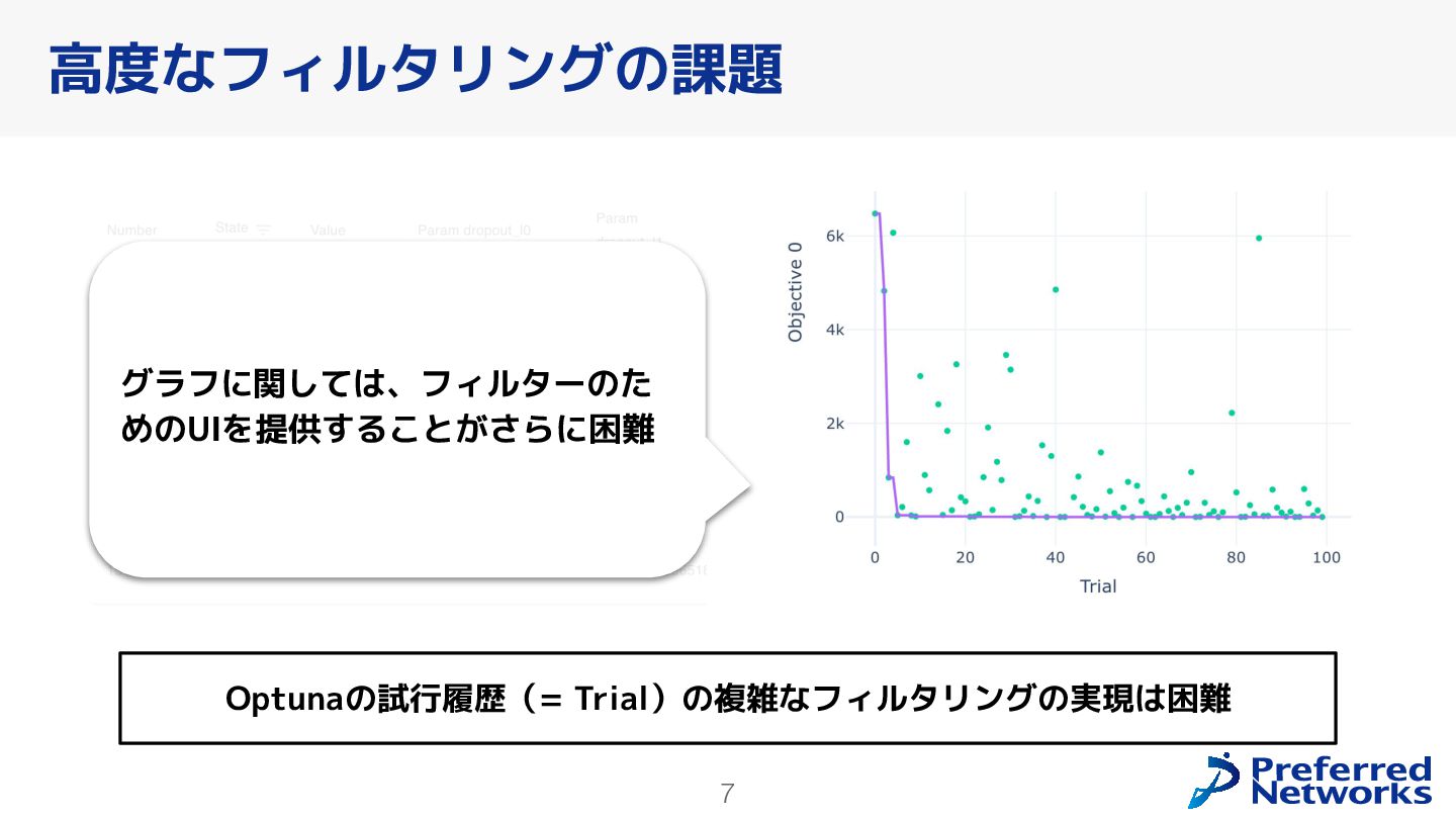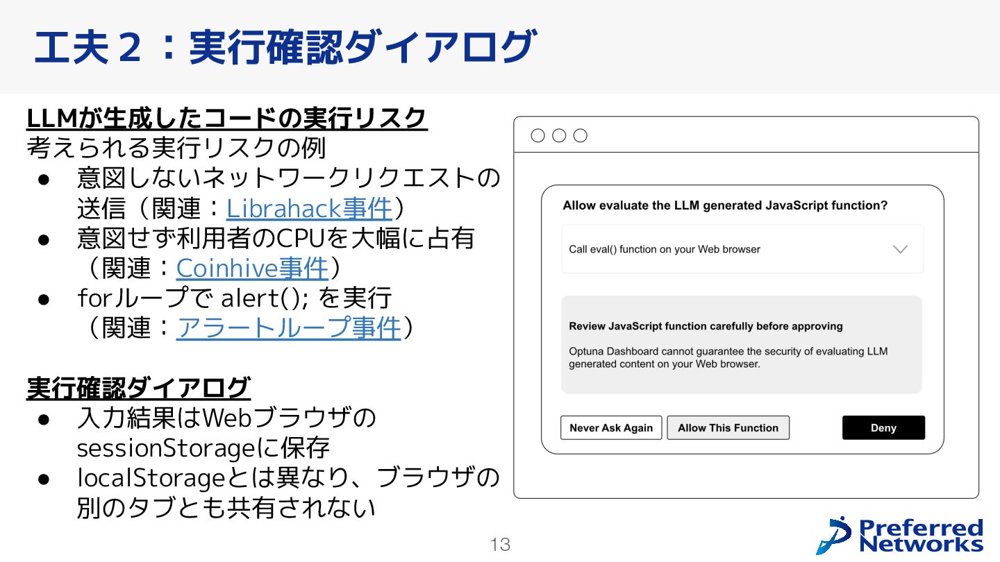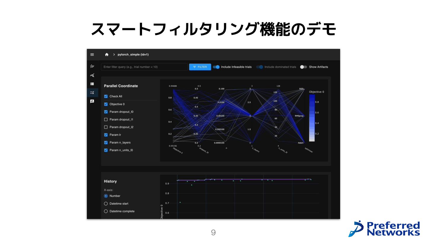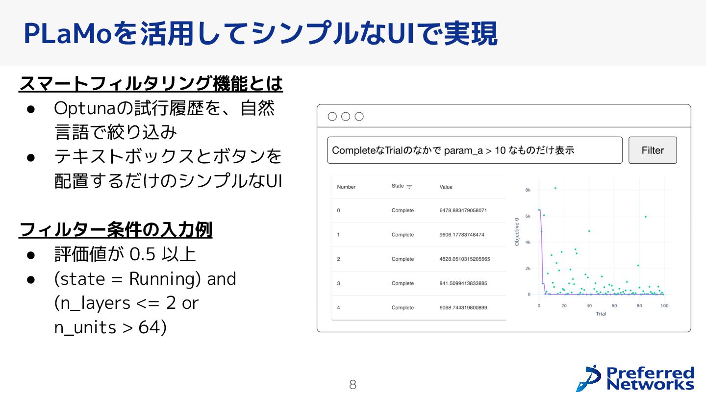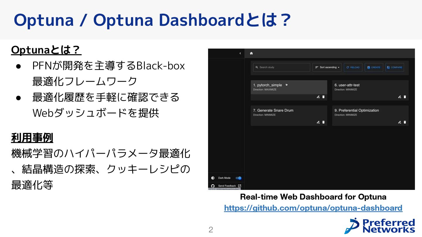 Optuna Dashboardは、ブラックボックス最適化フレームワークOptunaの最適化履歴を手軽に閲覧できるWebダッシュボードです。現在はPLaMo 2.1 Primeを含むLLMとの連携機能の開発を進めています。本発表ではその機能概要や技術的詳細、Webダッシュボード上でLLMと連携するための工夫についてお話します。
