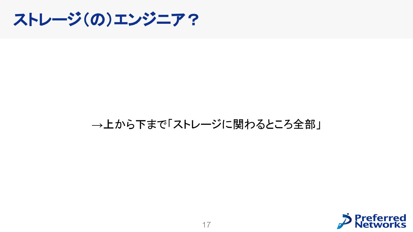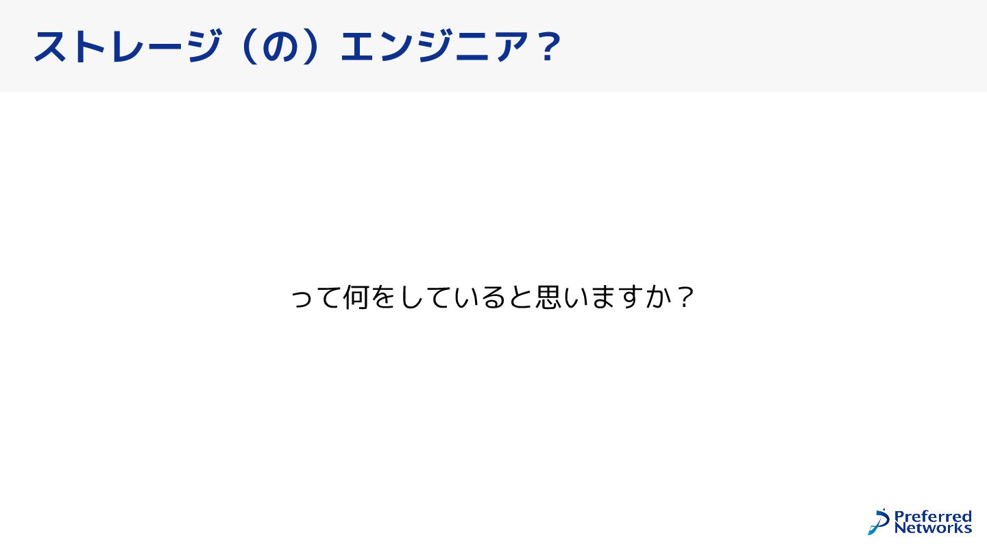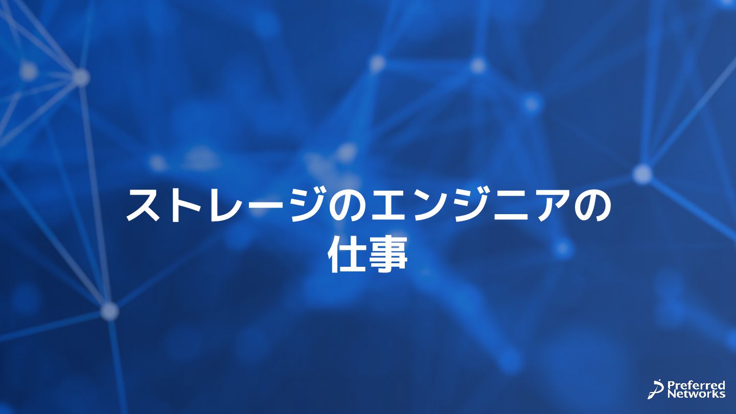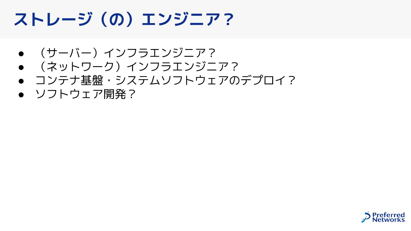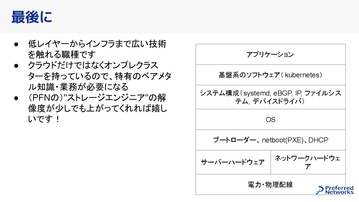 ブートローダー、netboot(PXE)、DHCP サーバーハードウェア ネットワークハードウェ ア 電力・物理配線 最後に • 低レイヤーからインフラまで広い技術 を触れる職種です • クラウドだけではなくオンプレクラス ターを持っているので、特有のベアメタ ル知識・業務が必要になる • (PFNの)"ストレージエンジニア"の解 像度が少しでも上がってくれれば嬉し いです!