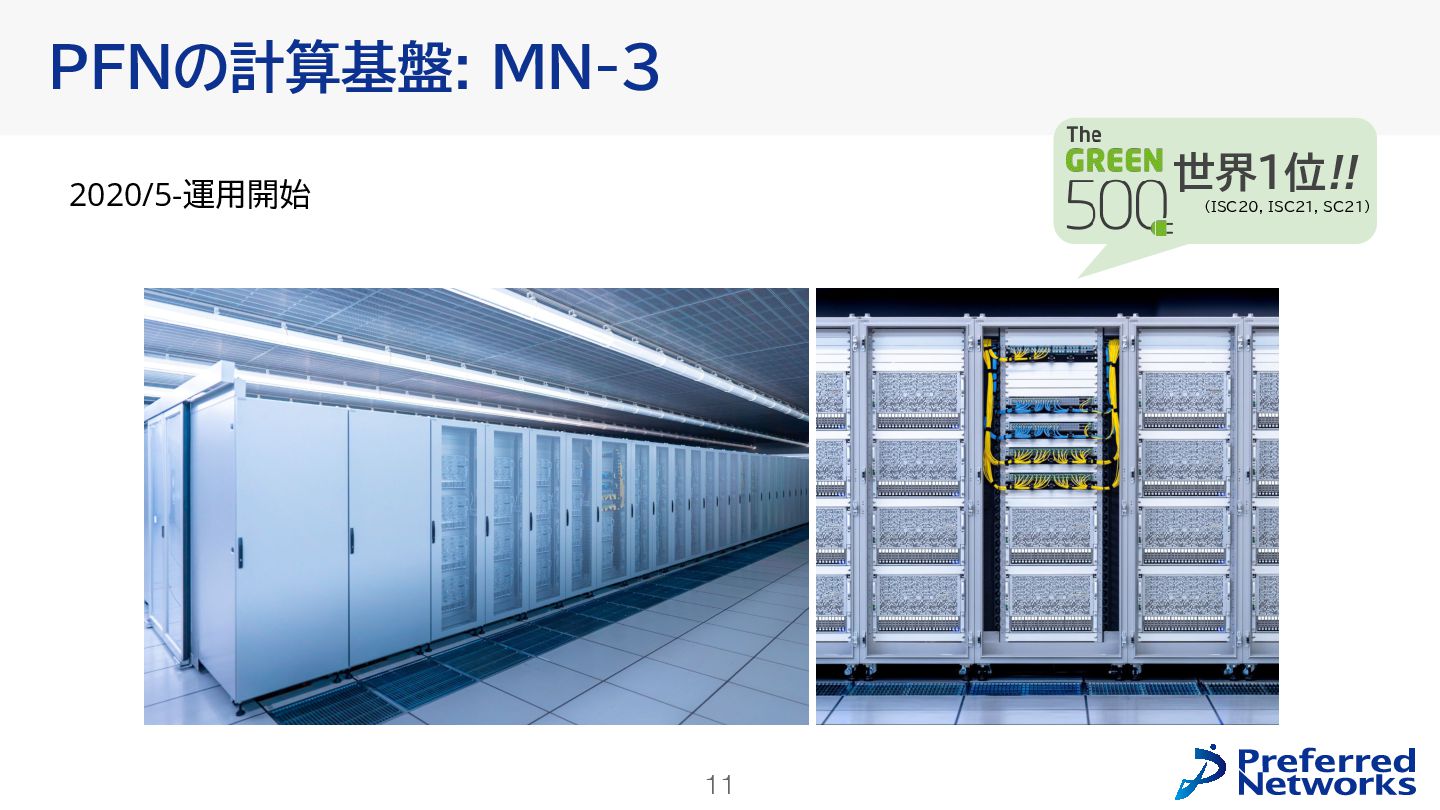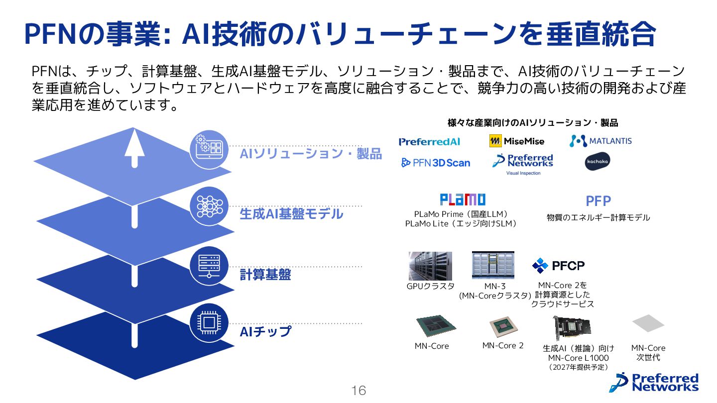 2 GPUクラスタ MN-3 (MN-Coreクラスタ) PLaMo Prime(国産LLM) PLaMo Lite(エッジ向けSLM) MN-Core 次世代 MN-Core 2を 計算資源とした クラウドサービス 物質のエネルギー計算モデル PFP 生成AI(推論)向け MN-Core L1000 (2027年提供予定) PFNは、チップ、計算基盤、生成AI基盤モデル、ソリューション・製品まで、AI技術のバリューチェーン を垂直統合し、ソフトウェアとハードウェアを高度に融合することで、競争力の高い技術の開発および産 業応用を進めています。