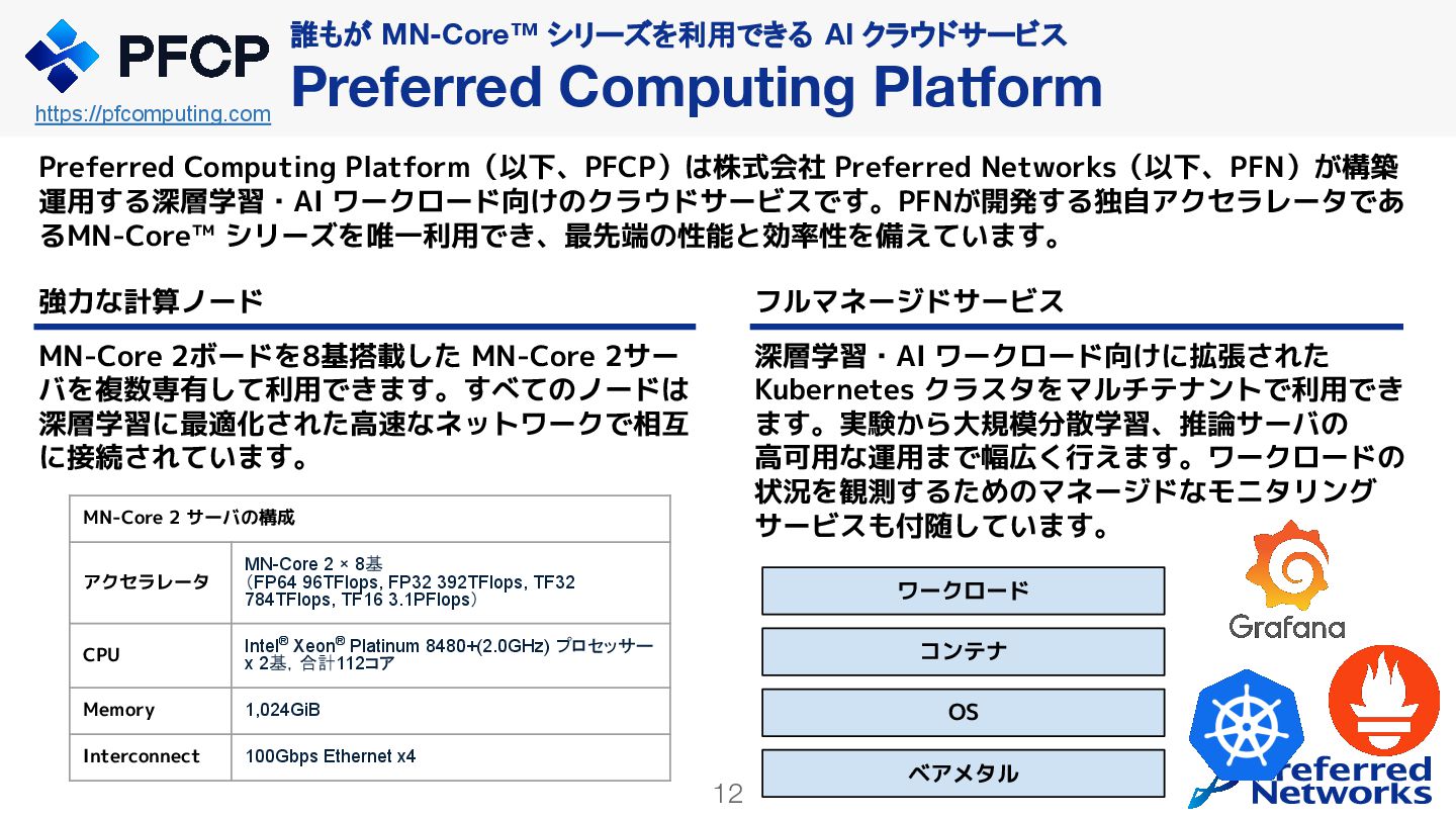 Computing Platform(以下、PFCP)は株式会社 Preferred Networks(以下、PFN)が構築 運用する深層学習・AI ワークロード向けのクラウドサービスです。PFNが開発する独自アクセラレータであ るMN-Core™ シリーズを唯一利用でき、最先端の性能と効率性を備えています。 強力な計算ノード MN-Core 2ボードを8基搭載した MN-Core 2サー バを複数専有して利用できます。すべてのノードは 深層学習に最適化された高速なネットワークで相互 に接続されています。 フルマネージドサービス 深層学習・AI ワークロード向けに拡張された Kubernetes クラスタをマルチテナントで利用でき ます。実験から大規模分散学習、推論サーバの 高可用な運用まで幅広く行えます。ワークロードの 状況を観測するためのマネージドなモニタリング サービスも付随しています。 MN-Core 2 サーバの構成 アクセラレータ MN-Core 2 × 8基 (FP64 96TFlops, FP32 392TFlops, TF32 784TFlops, TF16 3.1PFlops) CPU Intel® Xeon® Platinum 8480+(2.0GHz) プロセッサー x 2基,合計112コア Memory 1,024GiB Interconnect 100Gbps Ethernet x4 OS コンテナ ワークロード ベアメタル https://pfcomputing.com