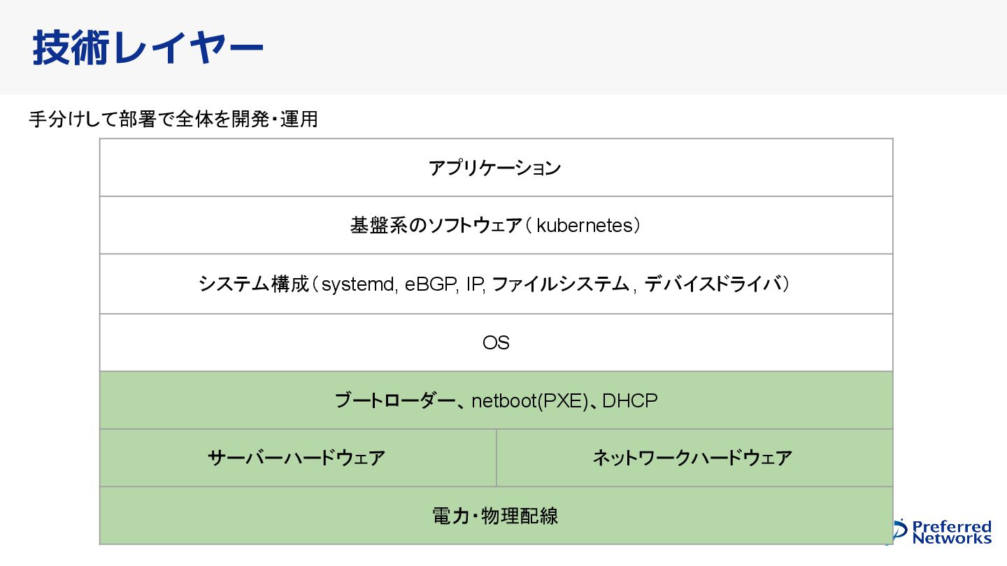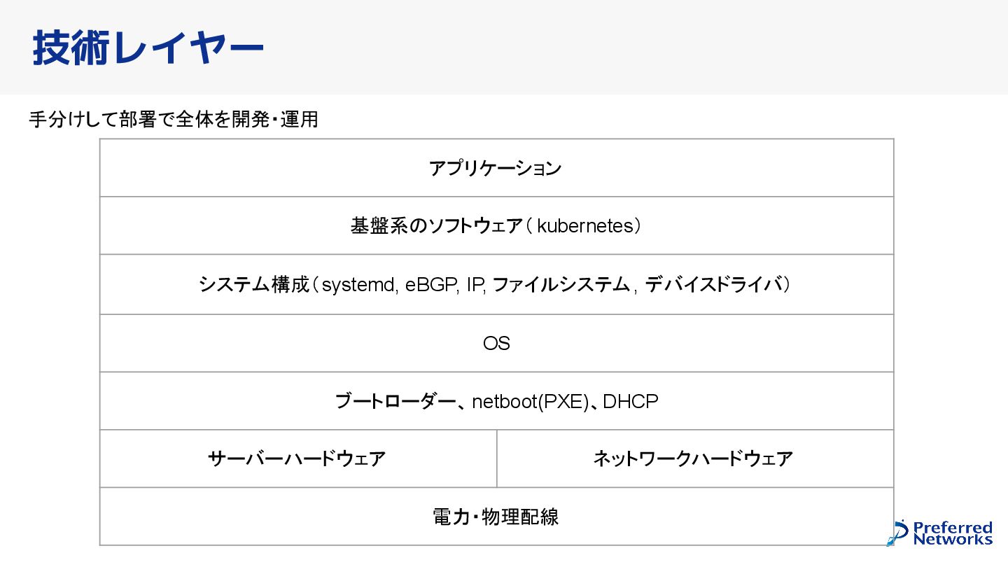 サーバーハードウェア ネットワークハードウェア 電力・物理配線 技術レイヤー 手分けして部署で全体を開発・運用