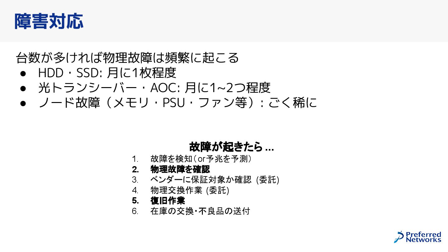 ごく稀に 故障が起きたら ... 1. 故障を検知(or予兆を予測) 2. 物理故障を確認 3. ベンダーに保証対象か確認 (委託) 4. 物理交換作業 (委託) 5. 復旧作業 6. 在庫の交換・不良品の送付