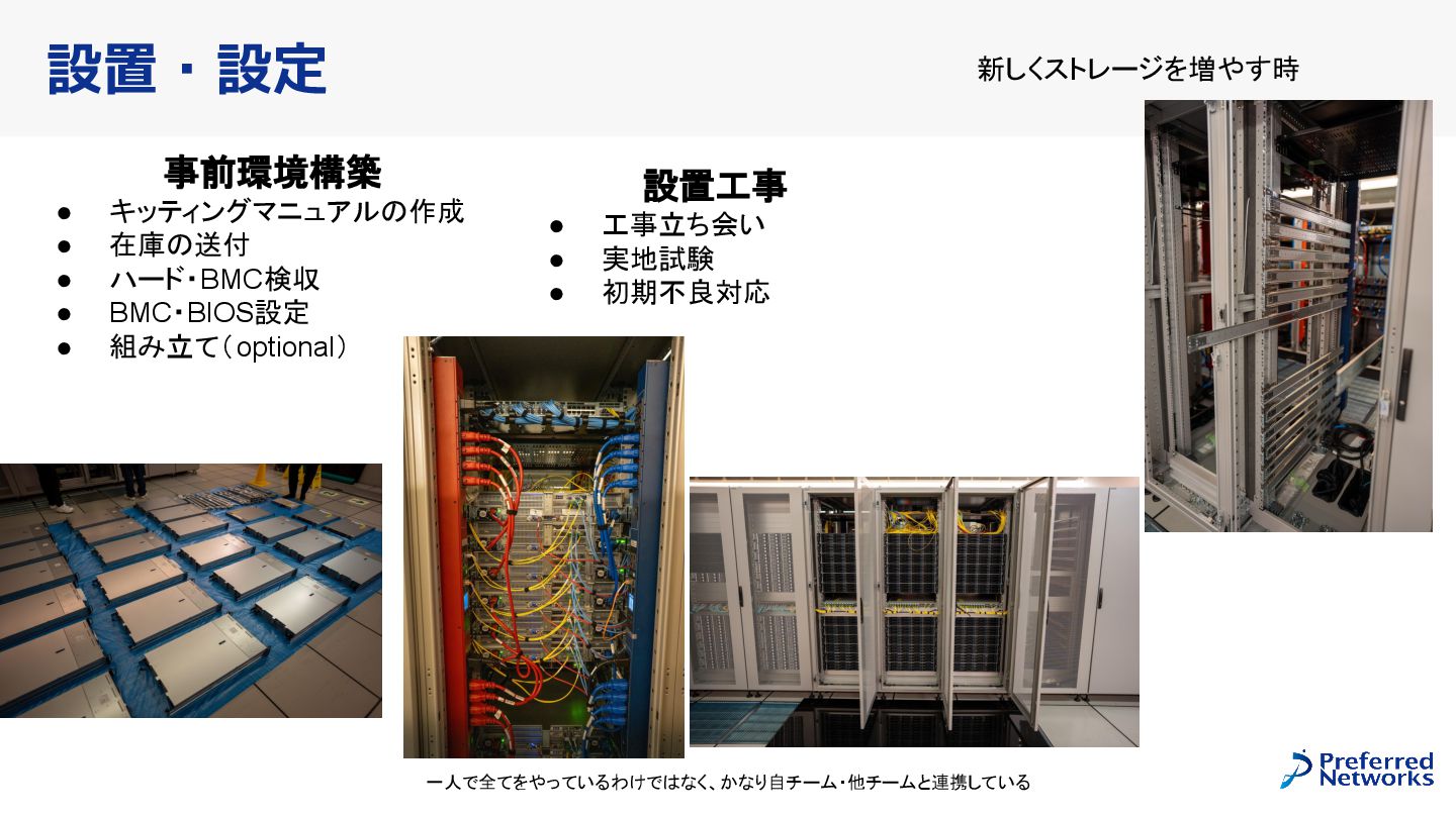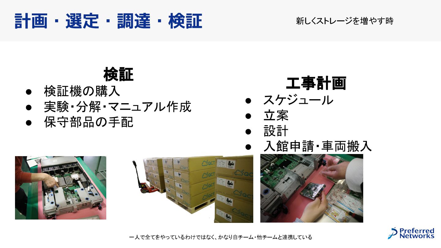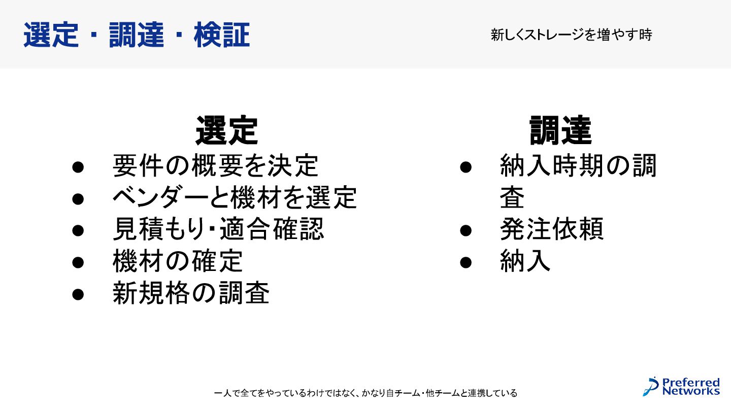 • 新規格の調査 調達 • 納入時期の調 査 • 発注依頼 • 納入 一人で全てをやっているわけではなく、かなり自チーム・他チームと連携している 新しくストレージを増やす時
