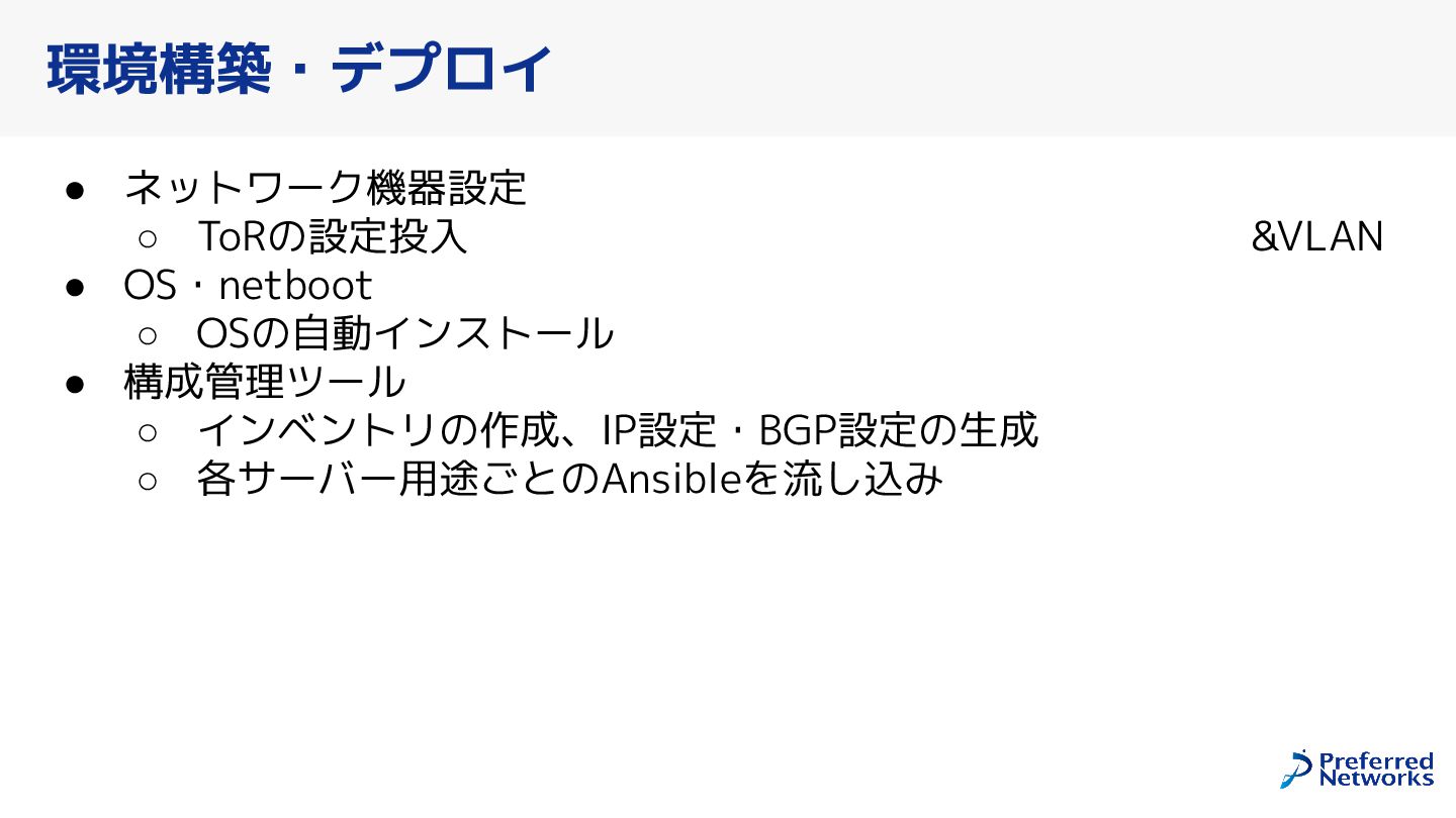 13. 環境構築・デプロイ • ネットワーク機器設定 ◦ ToRの設定投入、IPアドレス設計、BGPの設定、VRF&VLAN • OS・netboot ◦ OSの自動インストール •
