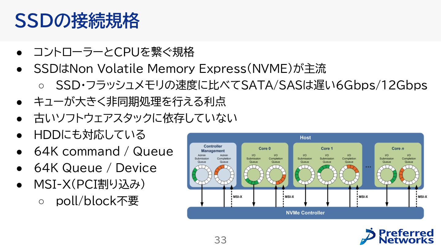 • キューが大きく非同期処理を行える利点 • 古いソフトウェアスタックに依存していない • HDDにも対応している • 64K command / Queue • 64K Queue / Device • MSI-X(PCI割り込み) ◦ poll/block不要 SSDの接続規格